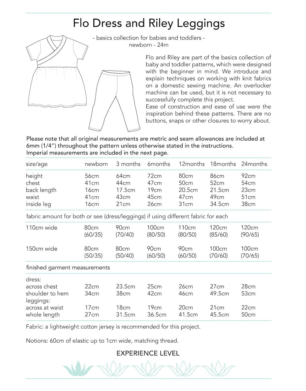 Flo and Riley are part of the basics collection of baby and toddler sewing patterns, which were designed with the beginner in mind. Ease of construction and ease of use were the inspiration behind these patterns. There are no buttons, snaps or other closures to worry about. You'll end up with the cutest baby outfit for your favourite little girl.