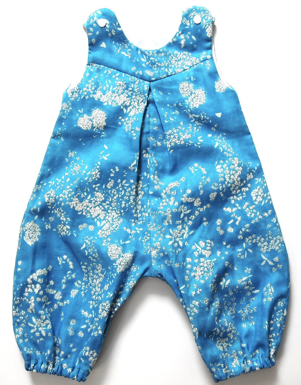 The pattern is designed with snap fasteners on the shoulders and leg seam for easy access. Other features include V shaped yoke, inverted front pleat detail, all-in-one arm and neckline facings and elastic hems.