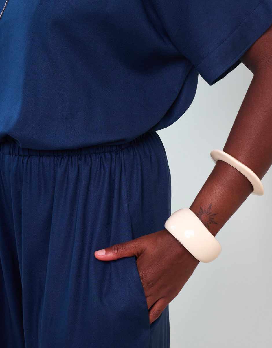 With a stroke of a magic pencil, we reinvent the culotte skirt into a trouser dress. A happy marriage that gives it an air that is both mischievous and graceful.