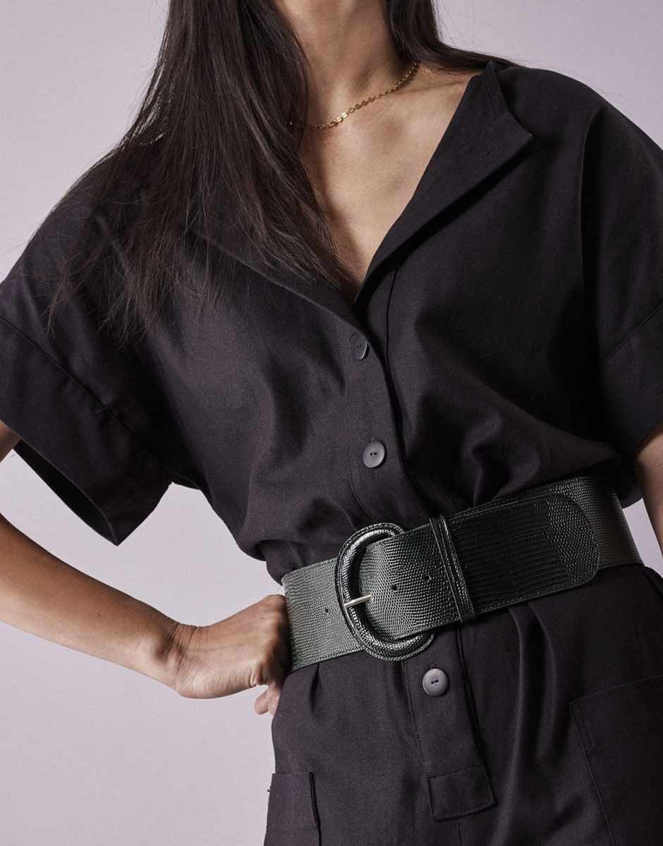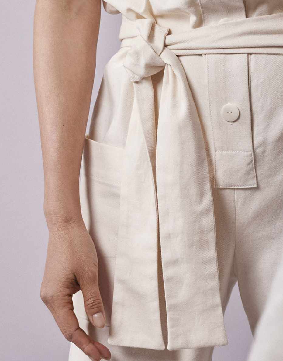 - A jumpsuit with a straight cut and feminine accents.3