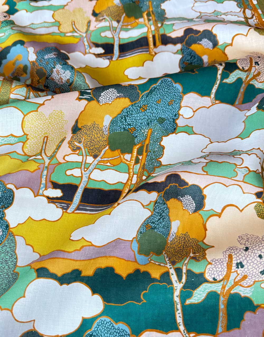 Prospect Road is an archival classic, based on a Liberty design from 1968. A revival of traditional Art Nouveau landscape prints, it features subtly arranged clusters of trees in a dreamy, jewel-toned setting.