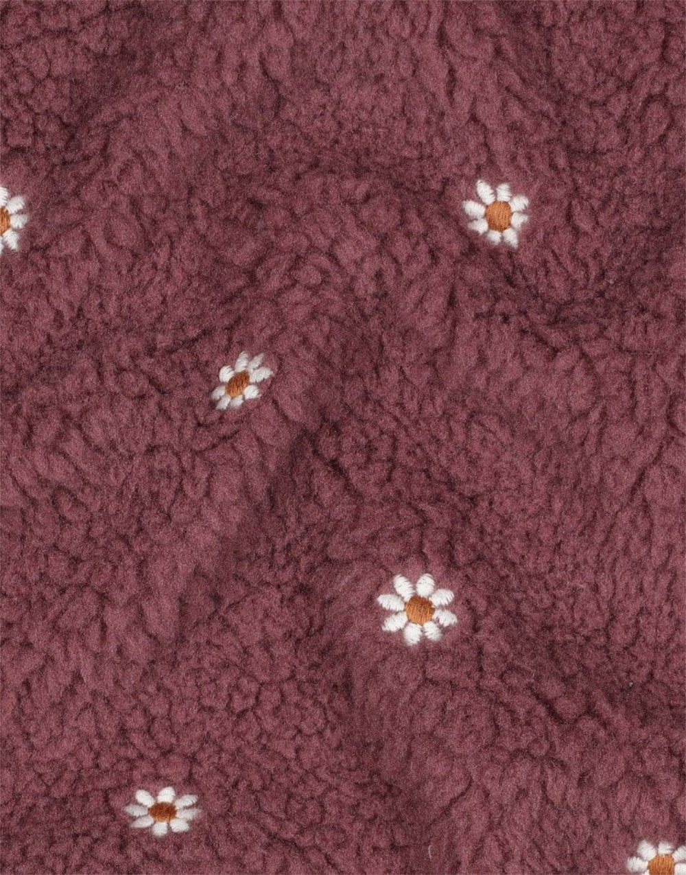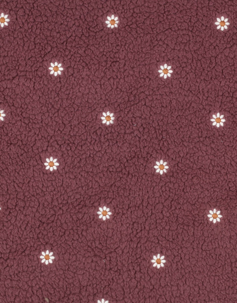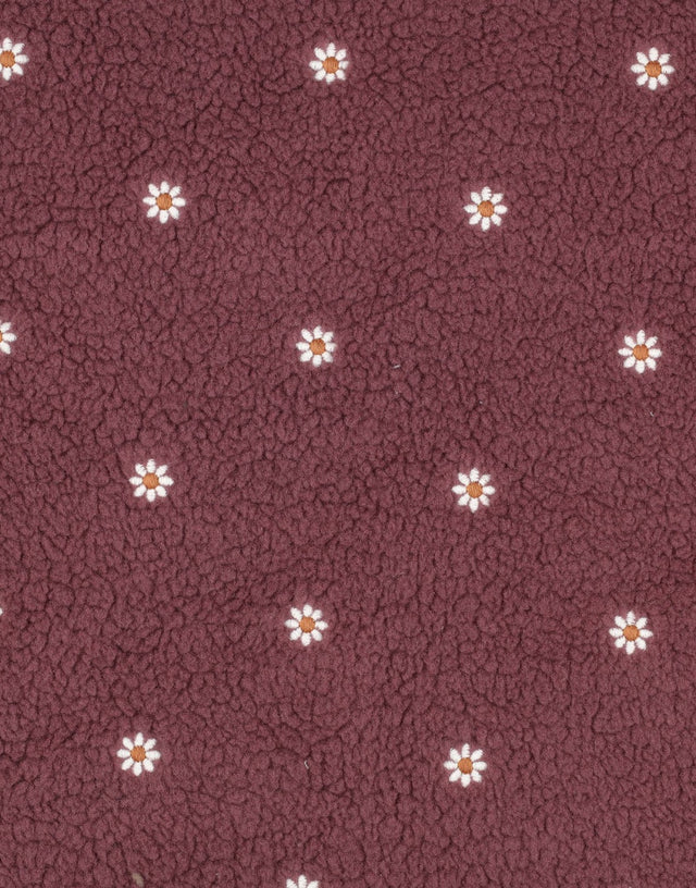 A wonderfully tactile fabric that combines cosy texture with delicate detailing. The plush teddy base, in a warm rosewood hue, is scattered with charming embroidered flowers, adding a whimsical, handcrafted feel. Soft, warm, and with a gentle stretch, it’s perfect for snuggly jackets, playful gilets, cosy loungewear, or statement accessories.