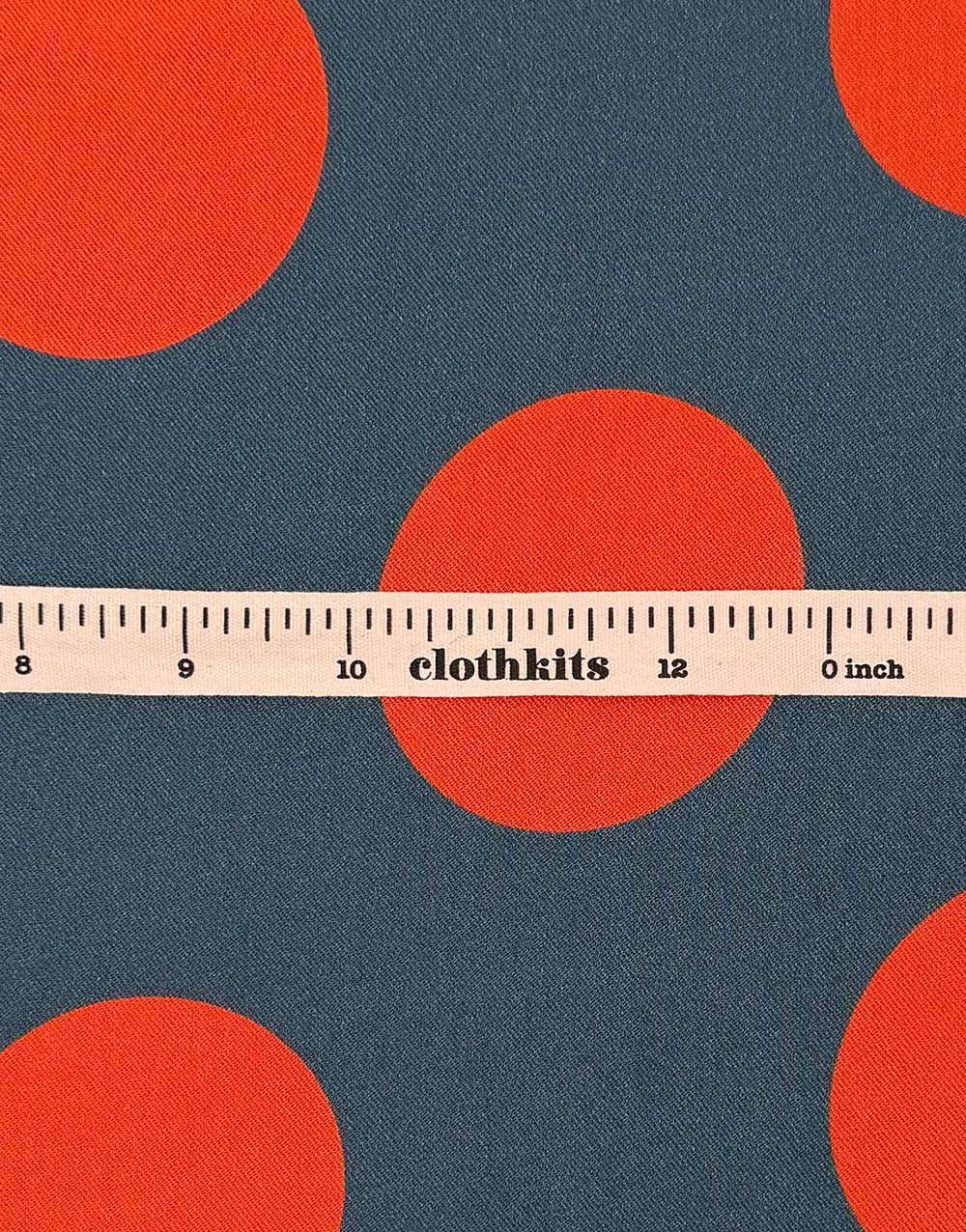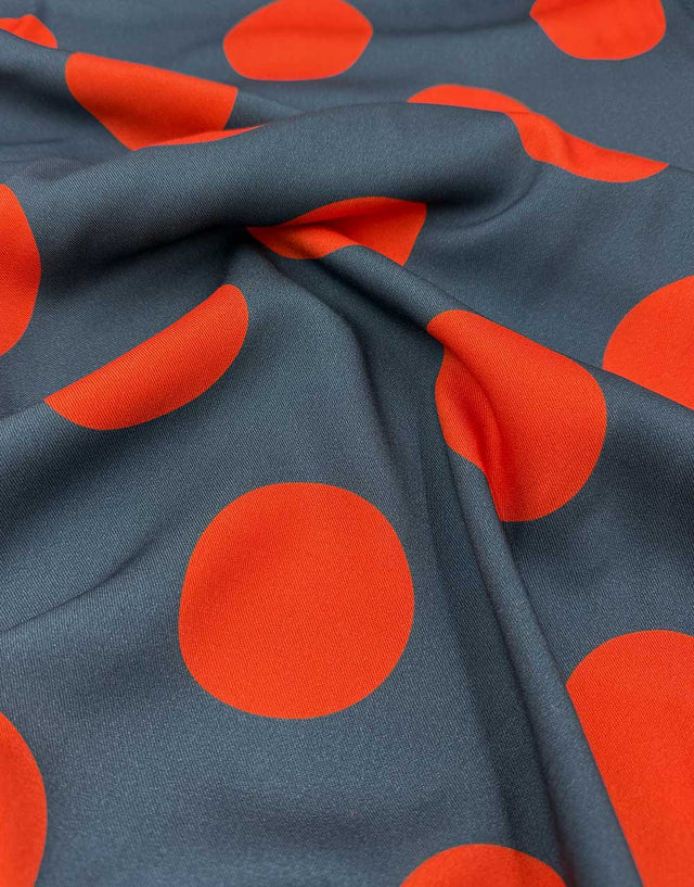Vivid and playful, this tangerine spot print bursts with personality. The oversized circles pop against a deep steely blue ground, creating a statement fabric with a retro edge. Lightweight with a fluid drape, it’s perfect for twirling dresses, chic blouses, or wide-leg trousers that radiate confidence.