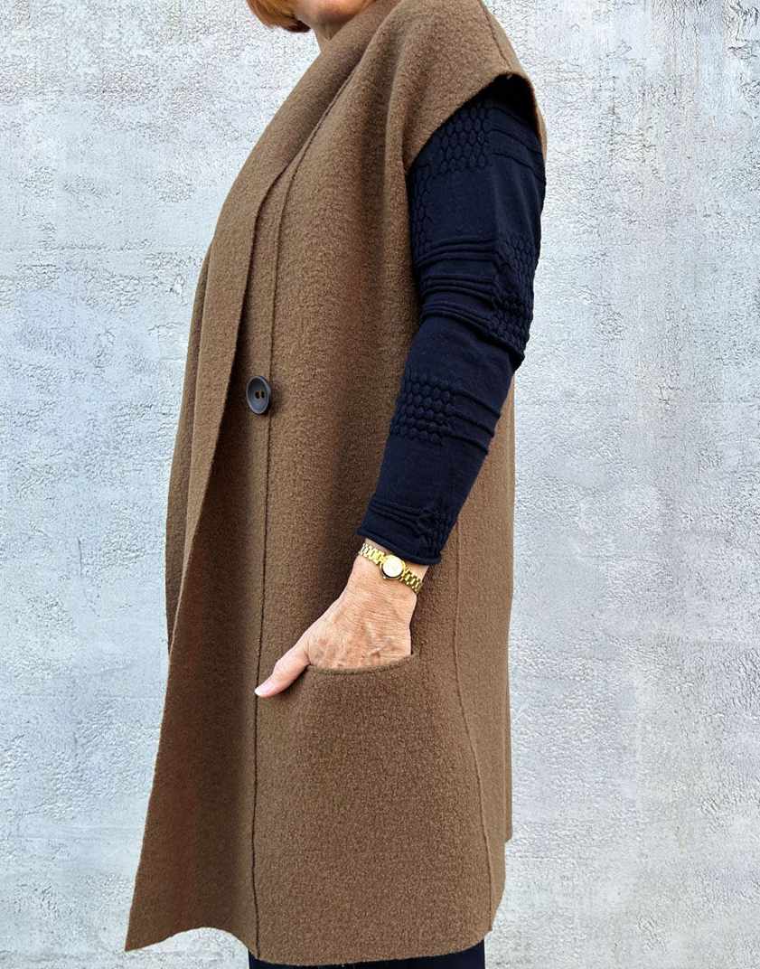 The Torino Vest Dressmaking Kit contains everything you need to create a beautifully tailored sleeveless layering piece with effortless style and comfort. Featuring a relaxed, slightly A-line silhouette, this versatile vest is designed with a cosy shawl collar, extended shoulders, and concealed hip pockets for a flattering and functional finish. The wide collar extends to the knee-length hem and can be worn open and draped, folded back to form a lapel, or wrapped and secured with a feature button and loop. A timeless wardrobe staple to throw over dresses, knits, or shirts through the changing seasons.
