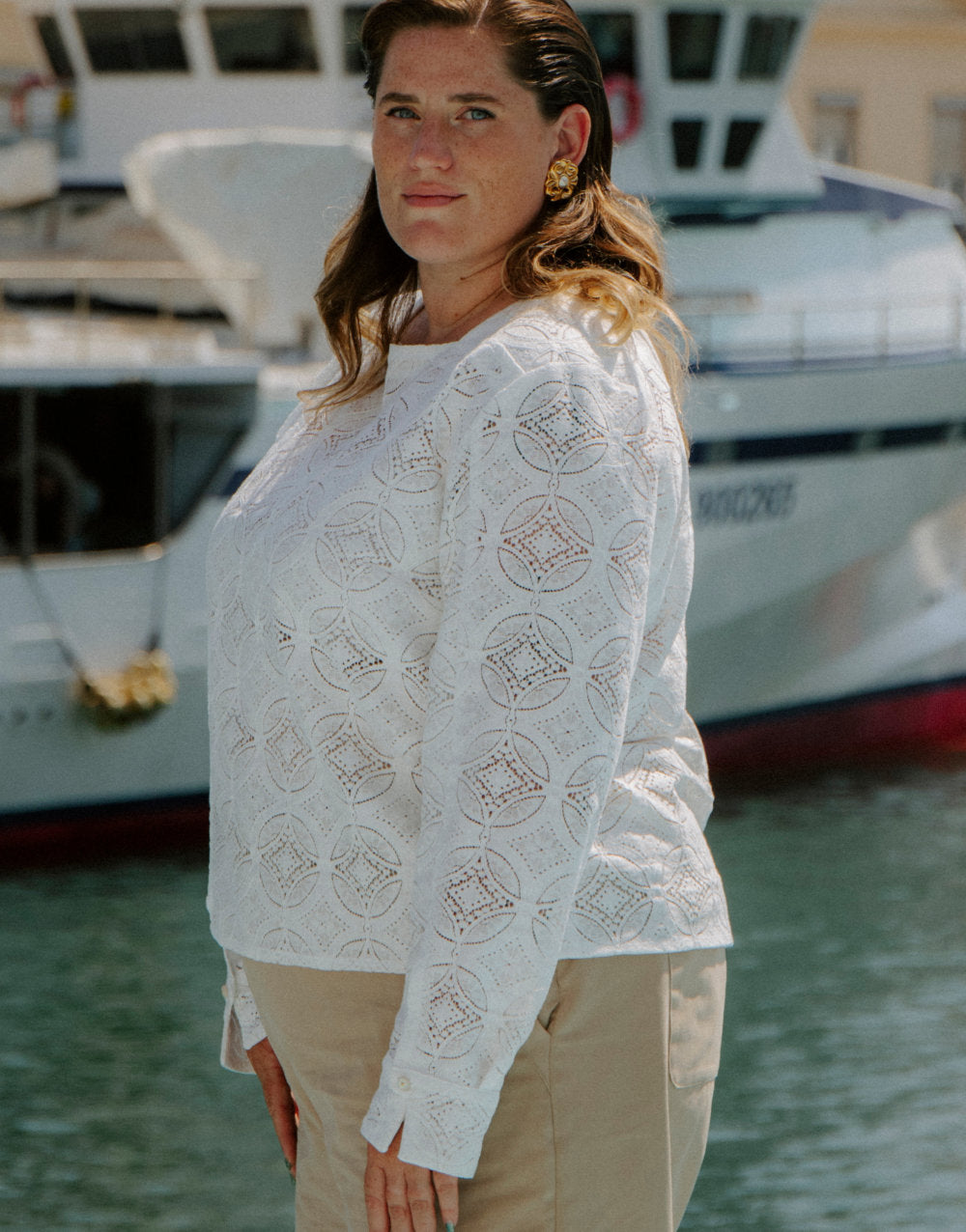 As delicate as the most worked blouse thanks to its small pleats, as original and essential as a sailor suit with its shoulder inserts, this pretty straight-cut blouse is set to become a wardrobe essential.