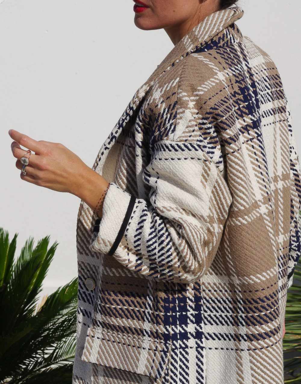 Suggested Fabrics: A supple wool (avoid a heavy pea coat type or stiff woolens), jacquard, tweed, fake fur, weighing around 300 to 550 g / m2 to highlight the shawl collar without hiding the dropped shoulders.