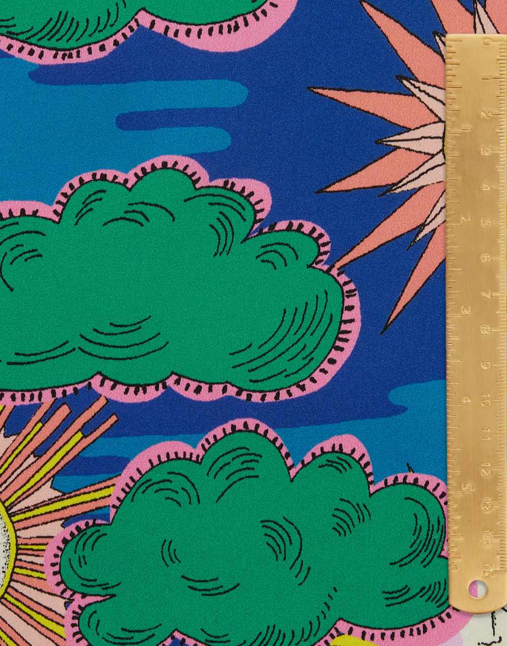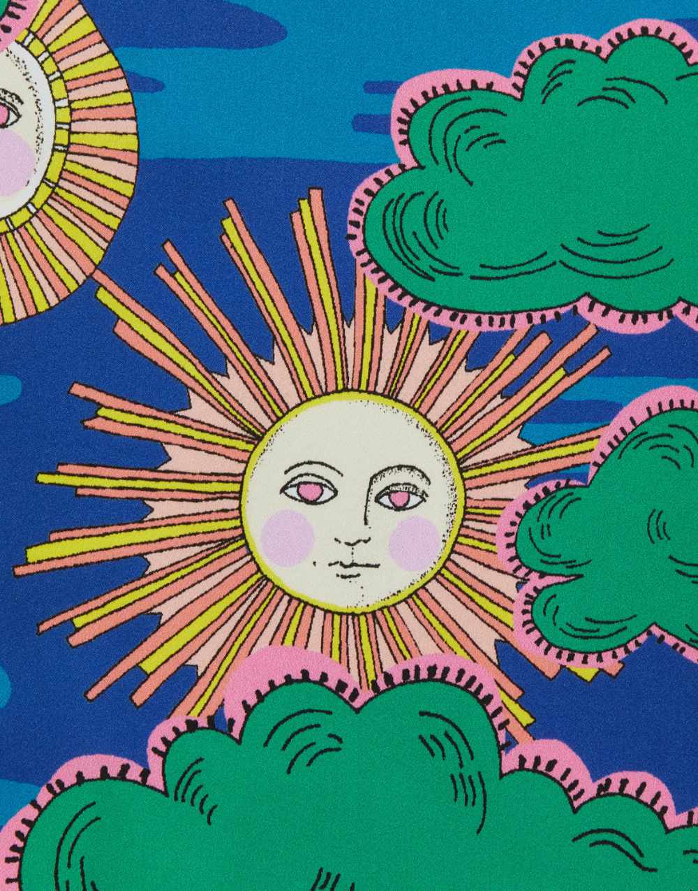Inspired by a Liberty scarf from the late 1950s and drawn in fine liner pen, this design has been rescaled for silk and hints at the life-giving force and healing powers of the sun.