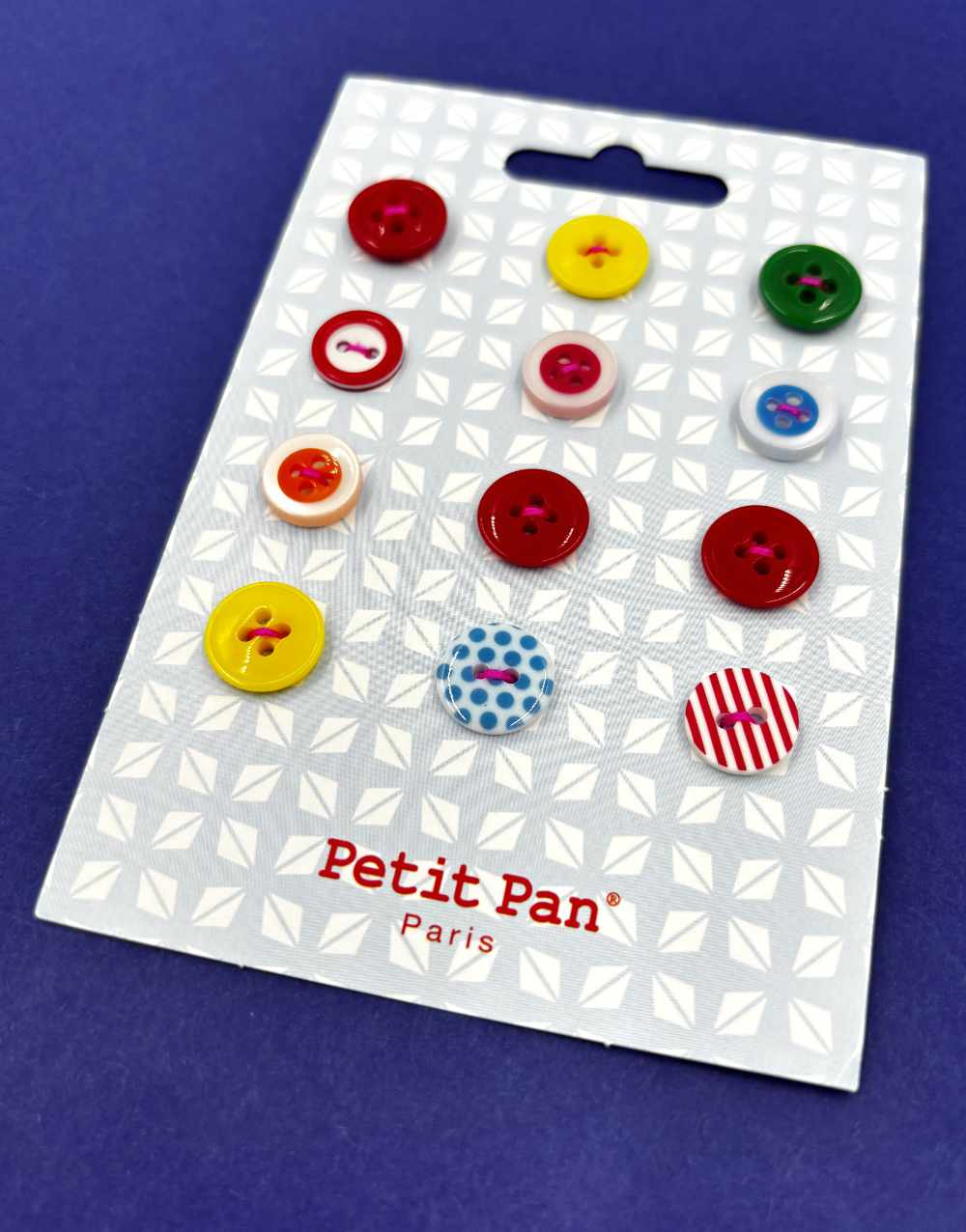 12 cute and colourful buttons on a card. Ideal for special finishing touches to your makes.