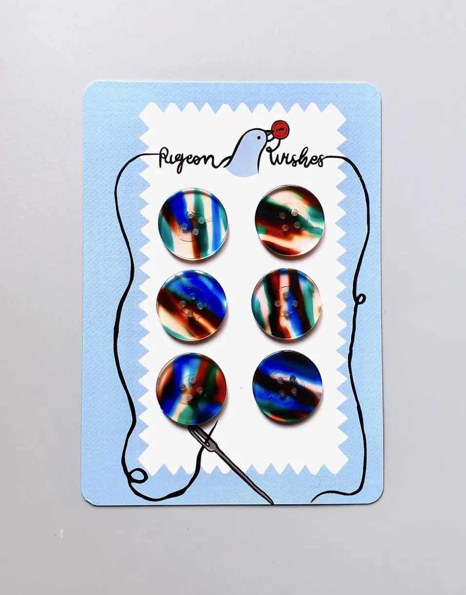 Shadow streams of browns, blues and greens. The Salem buttons bring to mind forests, rural settings and times past. This set of 25mm buttons are all totally and utterly unique, and the perfect size for jackets and coats. They are a lovely treat to add to your me-made clothing or to upcycle your existing pieces.