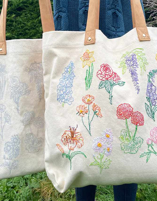 A DIY tote bag kit that flourishes as you sew over the gorgeous flowers and bring the canvas bag to life with colourful embroidery!