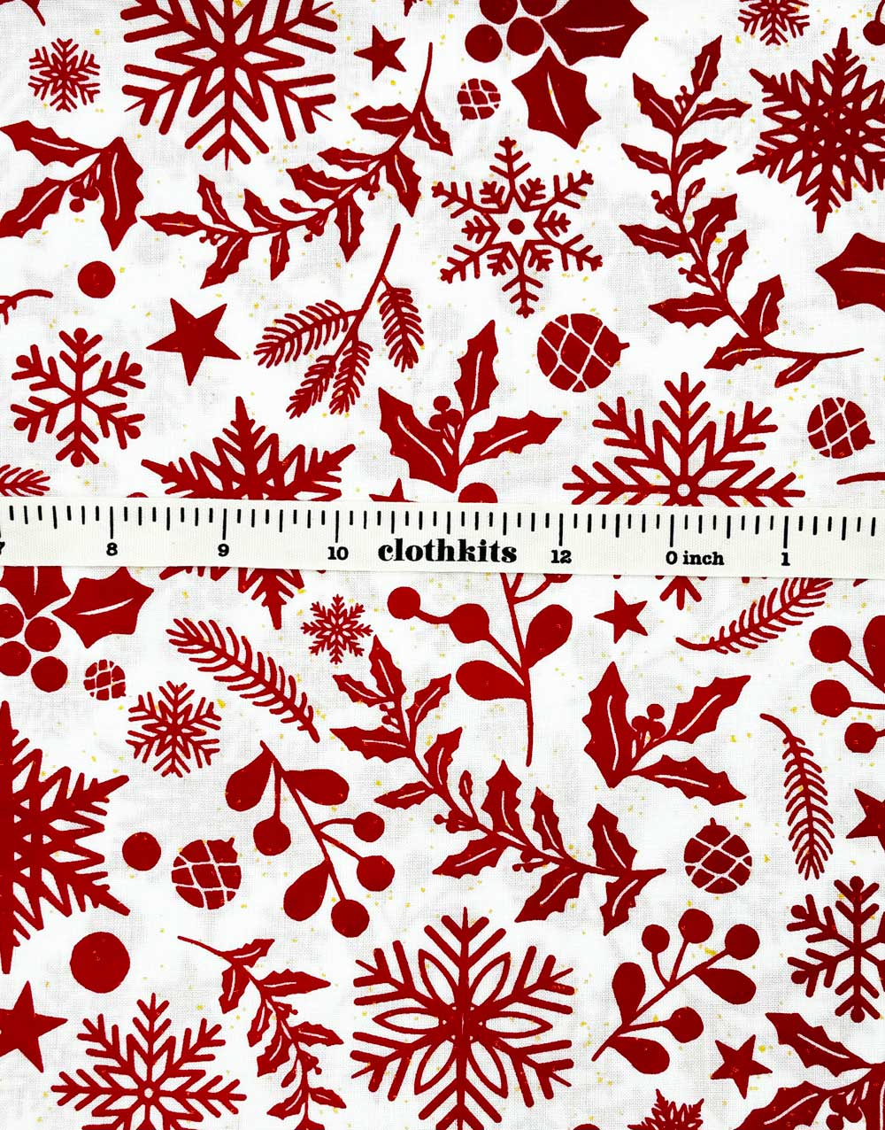 White fabric with a red holly, snowflake, festive foliage design, and glitter. Perfect for adding a bit of sparkle to your festivities! Read more