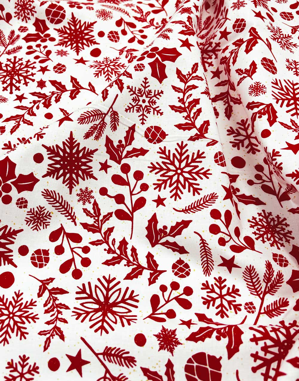 White fabric with a red holly, snowflake, festive foliage design, and glitter. Perfect for adding a bit of sparkle to your festivities!