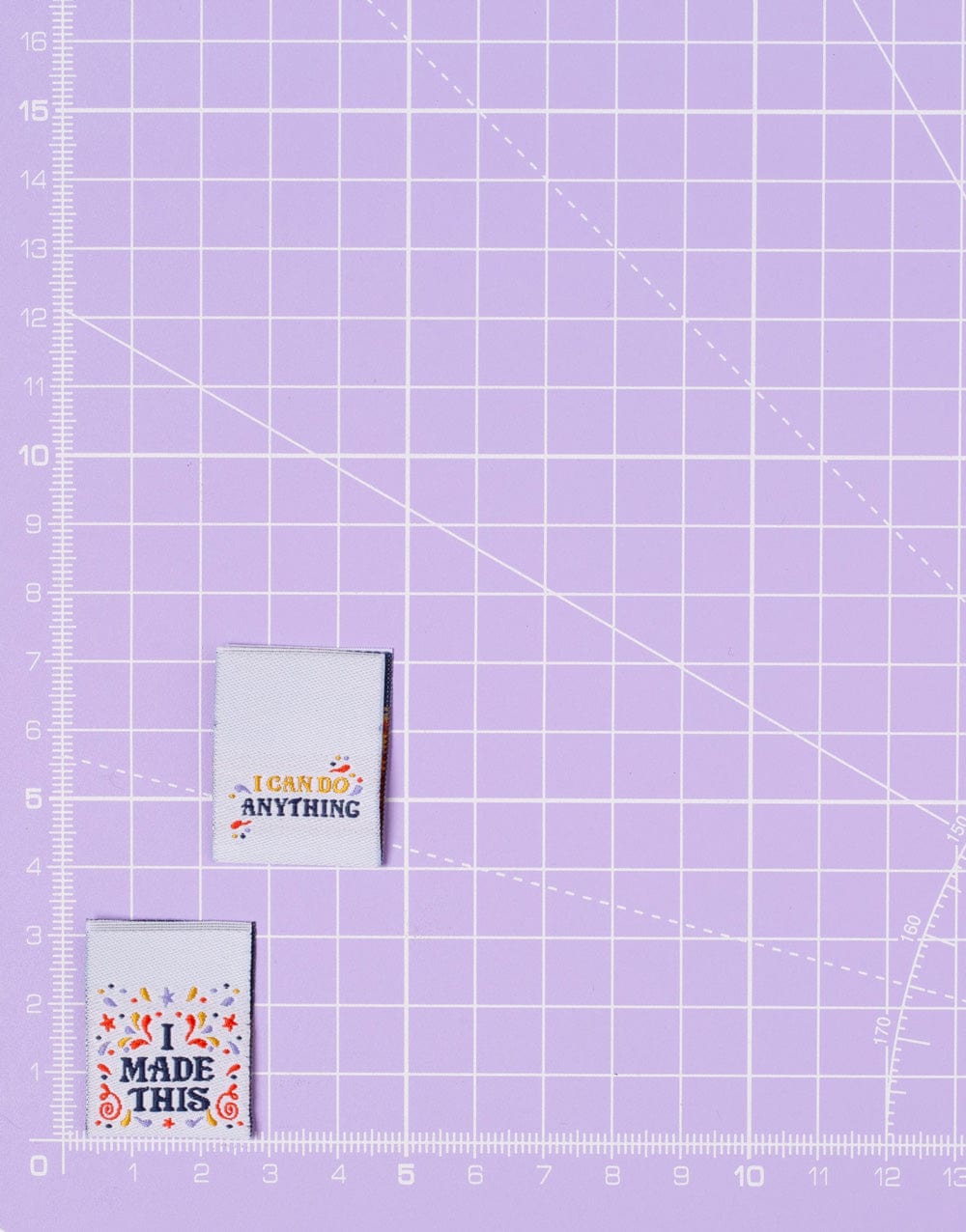 Pack of 6 woven labels. 'I MADE THIS - I CAN DO ANYTHING' is a double sided label with I MADE THIS on one side and I CAN DO ANYTHING on the other. You can sew this in with either phrase facing outward. The message 'I CAN DO ANYTHING' is so empowering. The words and surrounding doodles are woven in navy, mustard, coral and lilac on a white base.
