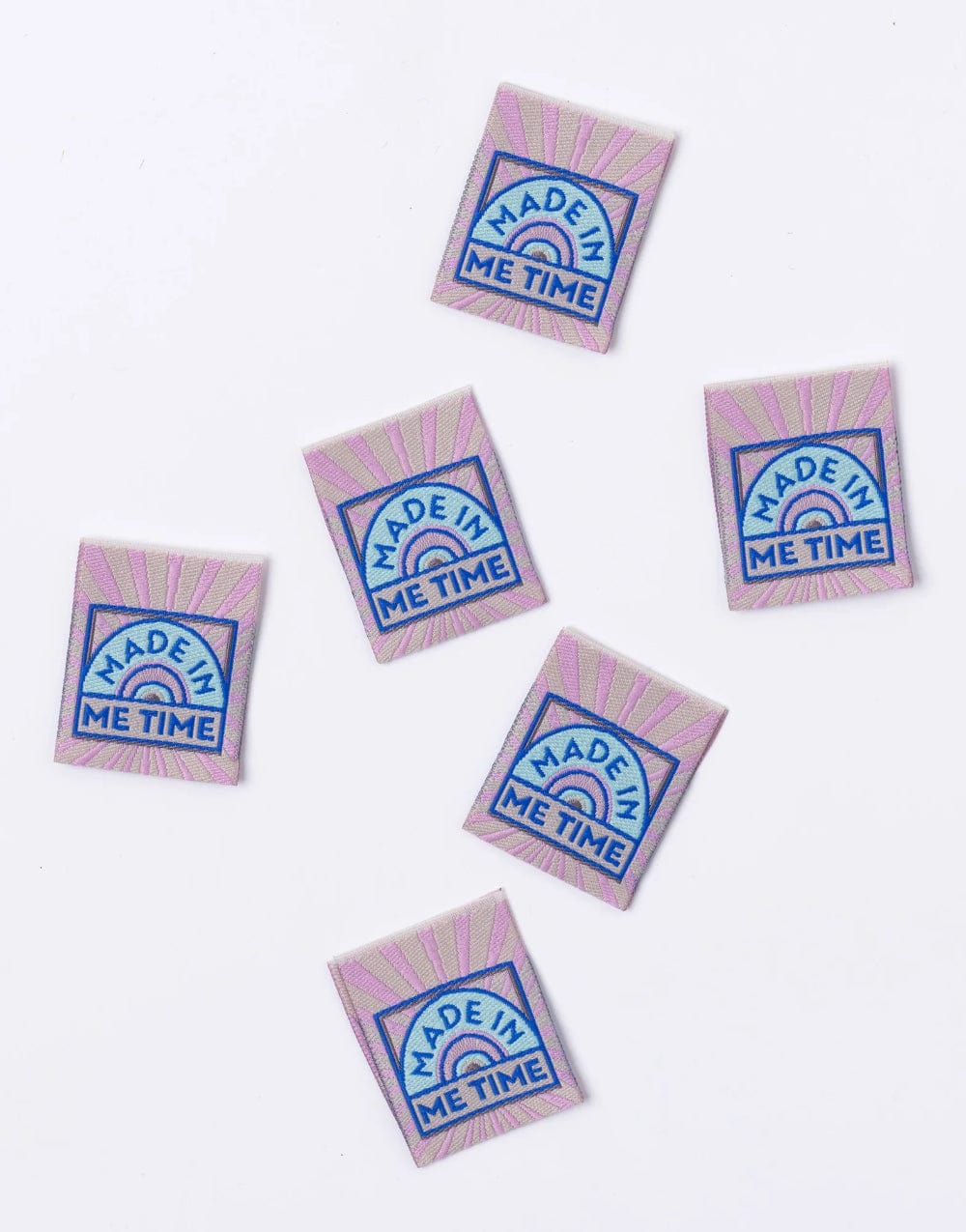 A pack of 6 woven labels with 'MADE IN ME TIME' woven in an art deco theme. For many of us, sewing is time for ourselves, time to escape to a creative world where we can focus and hopefully relax. This label celebrates this me time! Woven in blue thread on a detailed background of grey, lilac and turquoise threads.