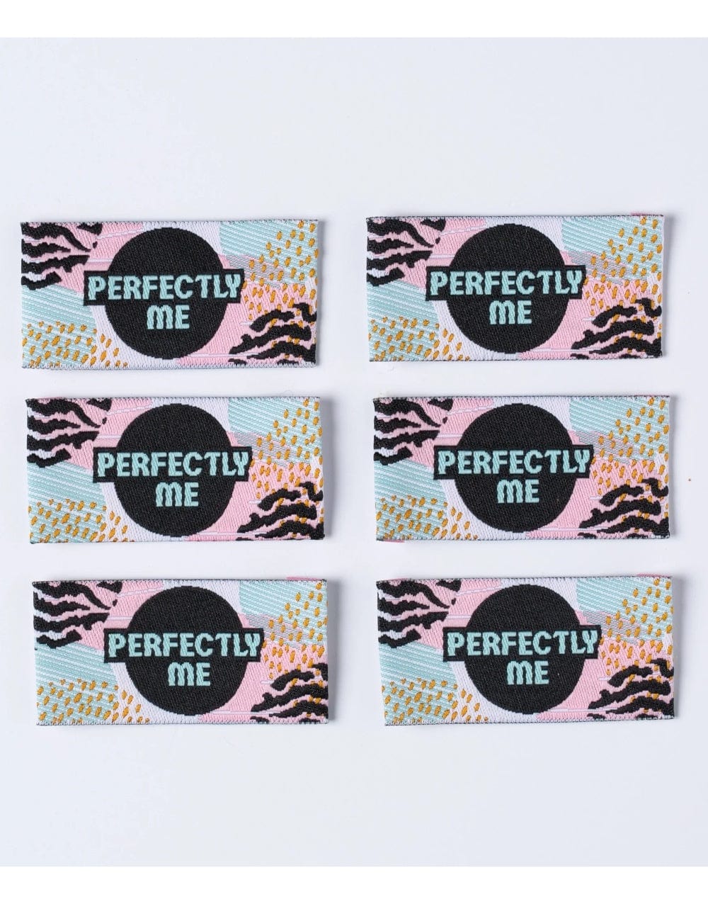 A pack of 6 woven labels with 'Perfectly Me' woven in a duck egg blue on a black circle. surrounded by other abstract circles in pink, mustard, and blue.