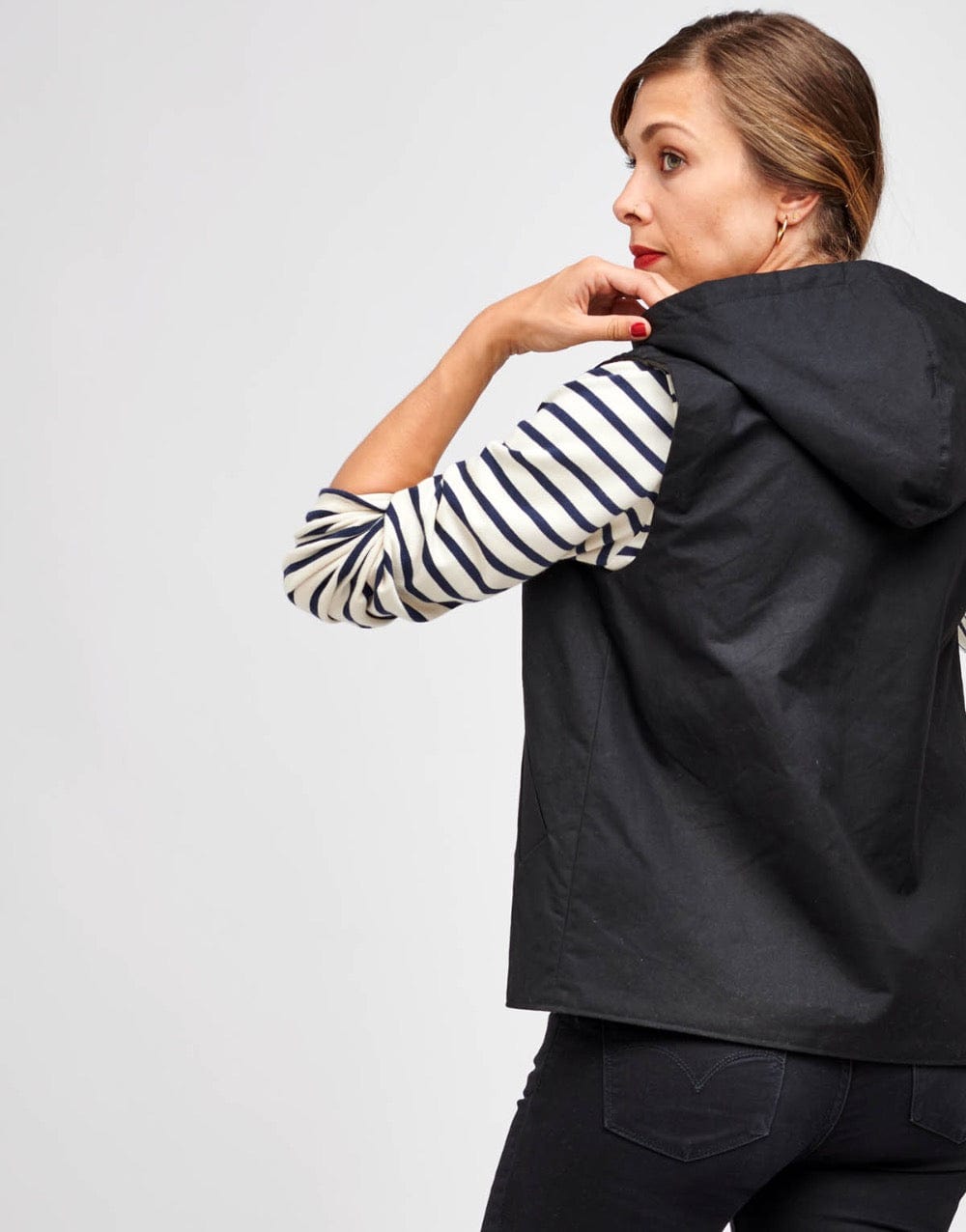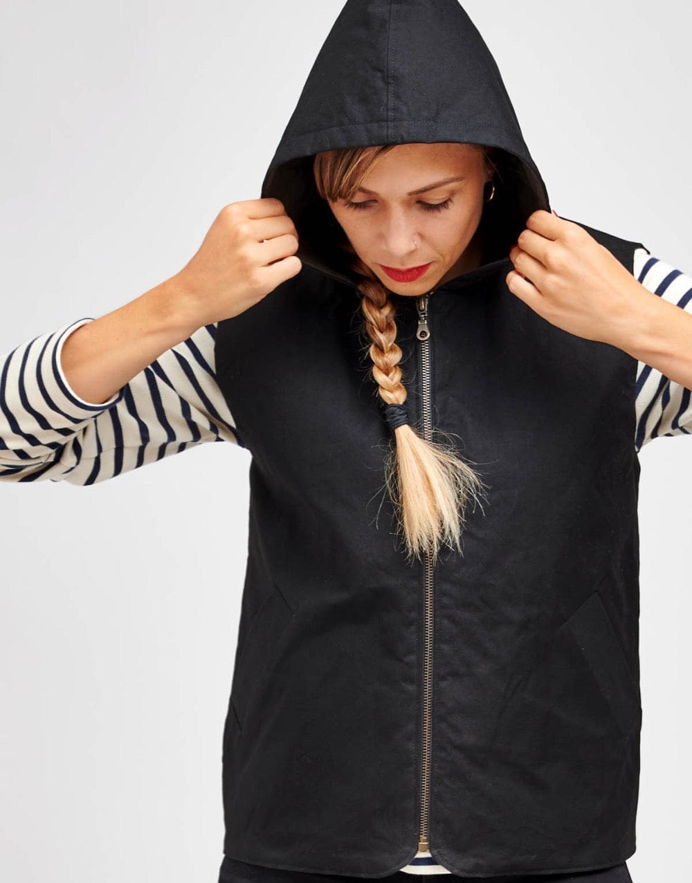 Hathor is a versatile and timeless sleeveless vest, offering 18 possible versions to suit every need and style. With a choice of three necklines (rounded, stand-up collar or hood), three pocket styles (patch, welt or none), and two closure methods (press studs or zip), this fully lined gilet is designed to adapt to any occasion.