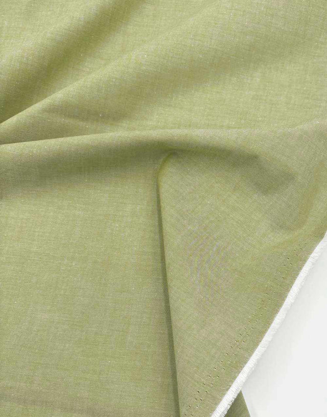 A lovely green chambray with a good drape. Chambray is a plain woven cotton fabric made with dyed warp yarn and white filling yarn. Chambray is lighter and softer than denim, woven differently and thinner in construction, it's a great fabric for dressmaking!