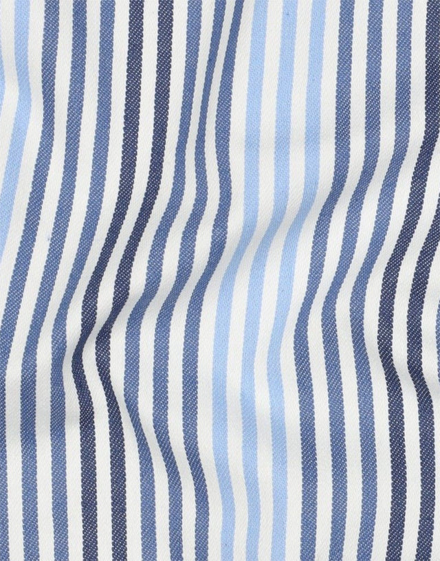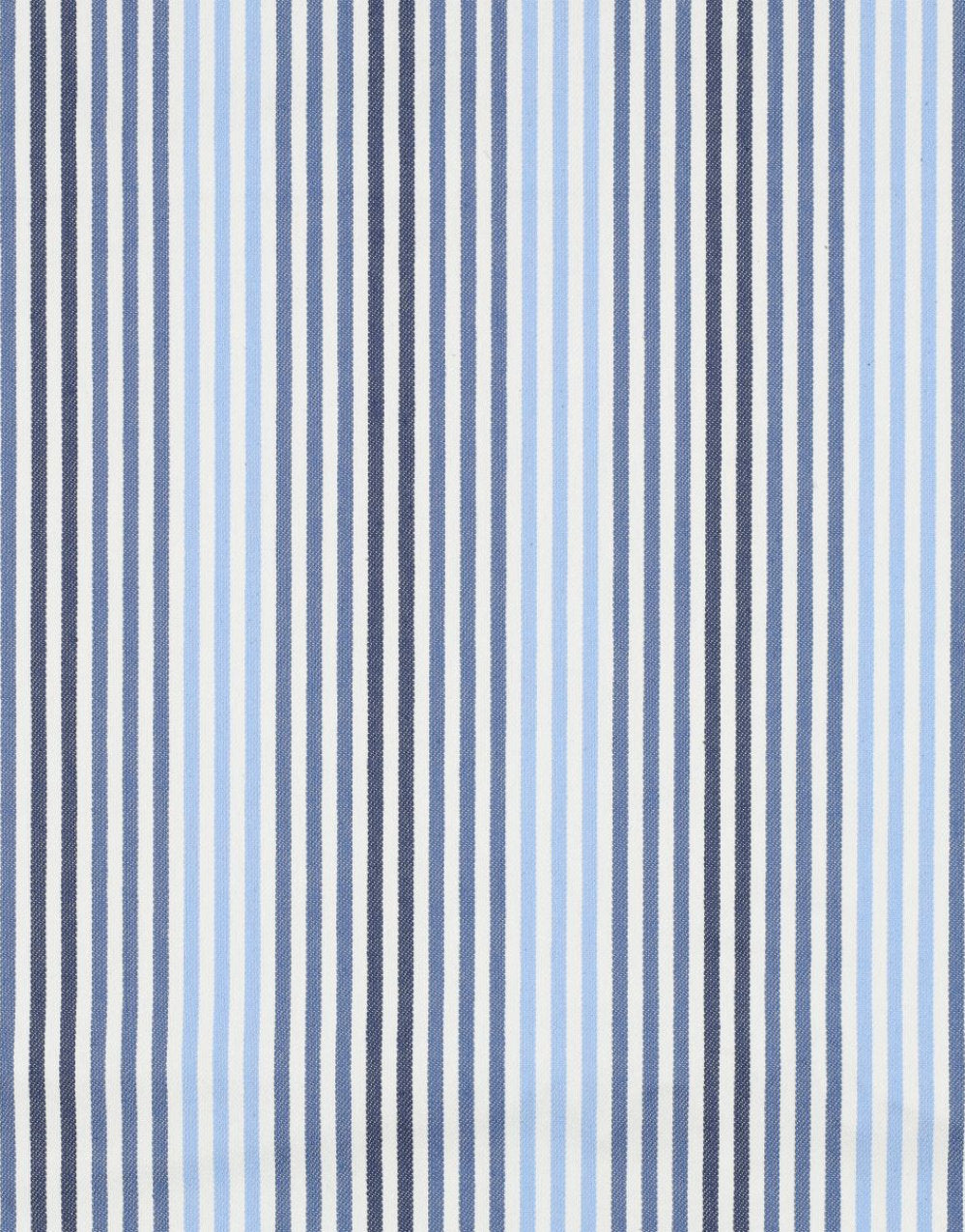 Crisp, clean stripes in alternating sky blue, indigo, and white give this woven fabric a timeless, nautical edge. With a smooth hand feel and a touch of stretch for comfort, it combines the cool breathability of cotton with the durability of polyester.