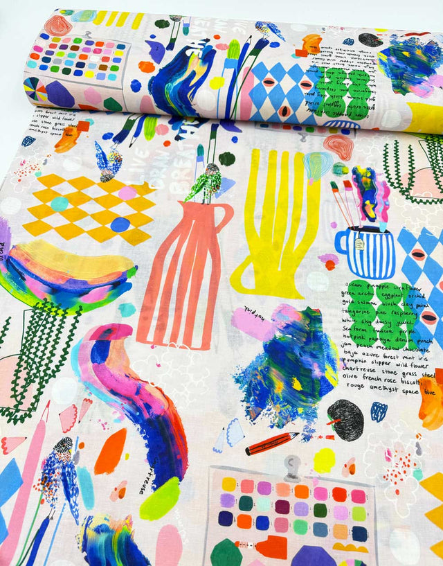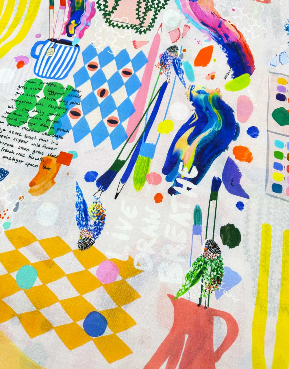 A creative explosion in fabric form! The Artist’s Way (Large Scale) is a joyful homage to messy studios, wild brushstrokes and the freedom of making. Painted textures, cheeky colour notes and scattered tools of the trade are layered over a warm blush background, with everything from budgies in jugs to smudged palettes and the words “LIVE, DRAW, BREATHE” printed through the scene.
