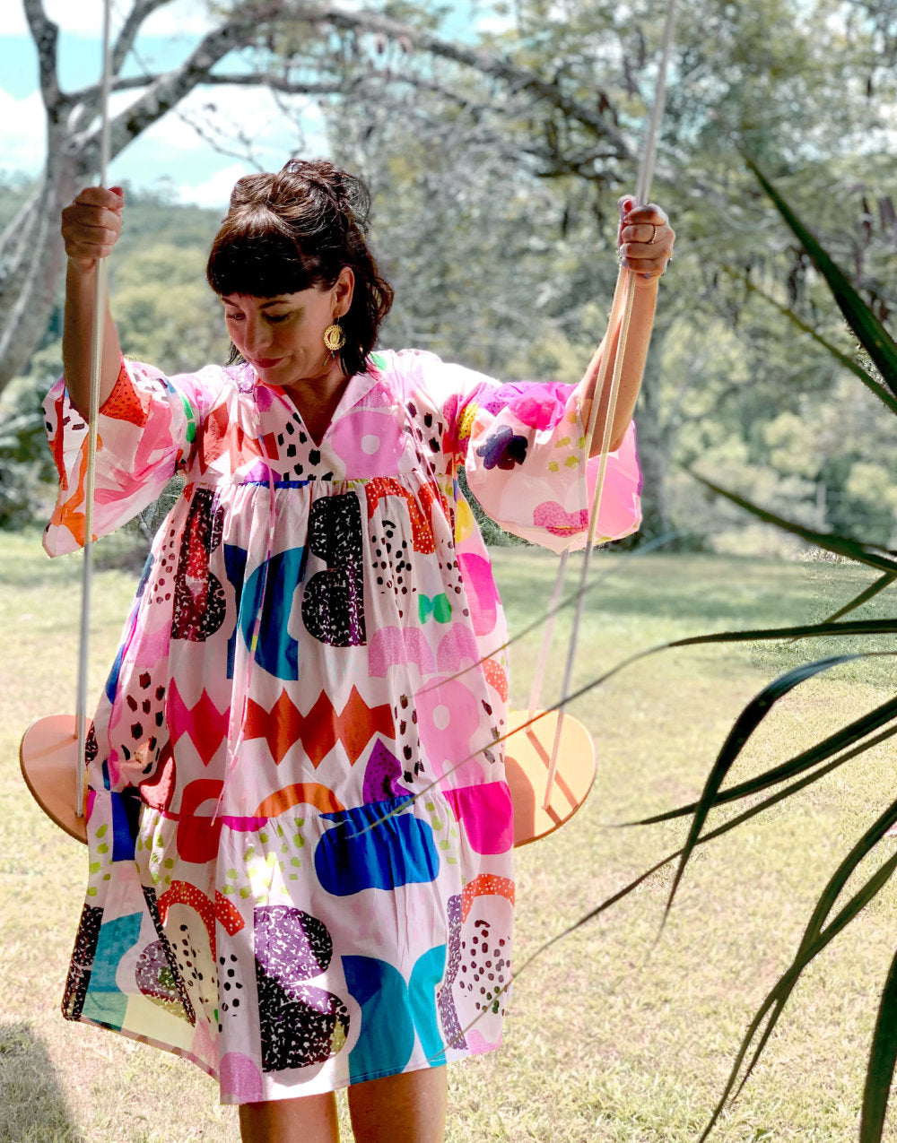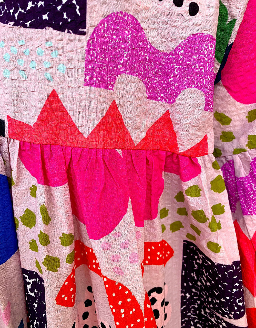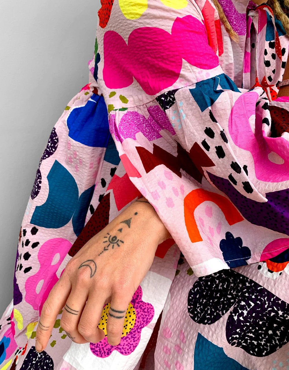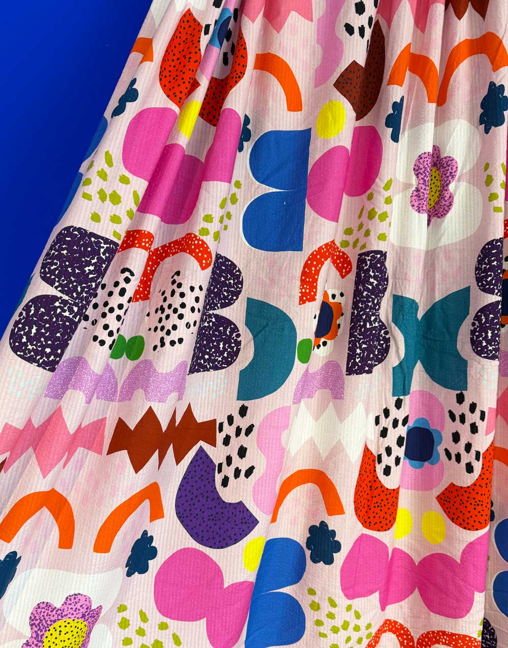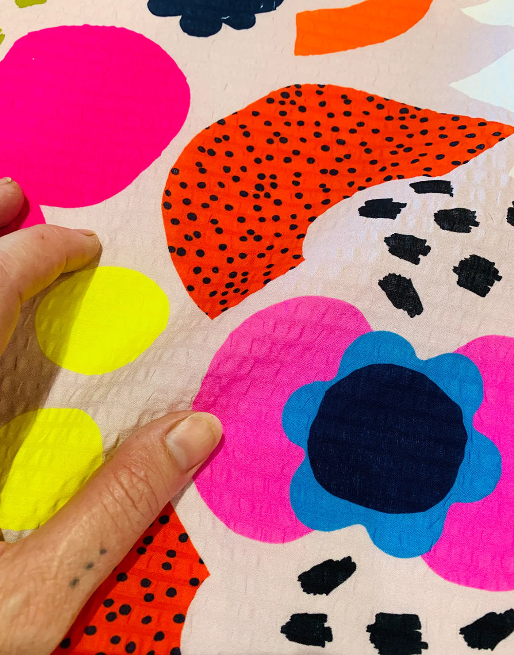 Bursting with colour and character, Peach Kooki is a joyous riot of bold blooms, punchy shapes and playful pattern. This cotton seersucker from Australian indie favourites Doops Designs is a feast for the eyes - think fuchsia florals, zesty citrus, and inky abstract motifs dancing across a peachy-pink base.