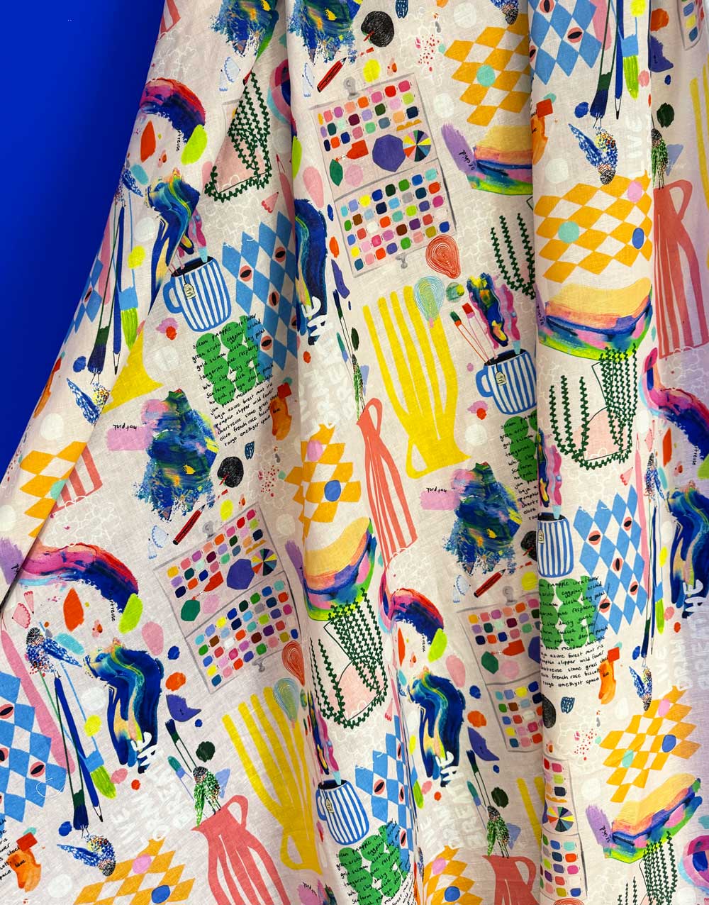 A creative explosion in fabric form! The Artist’s Way (Small Scale) is a joyful homage to messy studios, wild brushstrokes and the freedom of making. Painted textures, cheeky colour notes and scattered tools of the trade are layered over a warm blush background, with everything from budgies in jugs to smudged palettes and the words “LIVE, DRAW, BREATHE” printed through the scene.