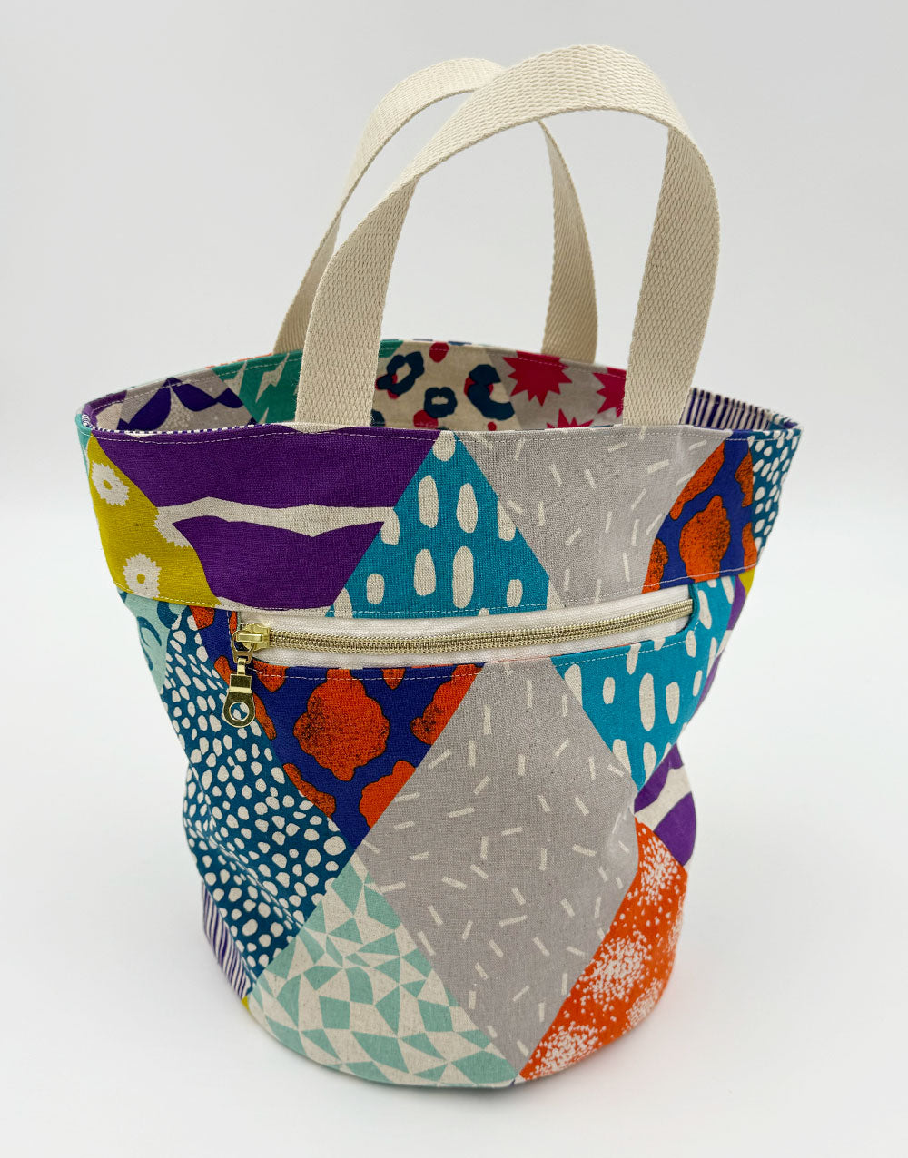 This version showcases Echino’s glorious Rhombus Cotton Linen Canvas - a joyful patchwork of colour that brings instant sunshine to your sewing table. The print dances with a mosaic of rhombus shapes, each filled with playful mini-patterns, which are ideal for this bag. It’s a fabric that makes every stitch feel fun.