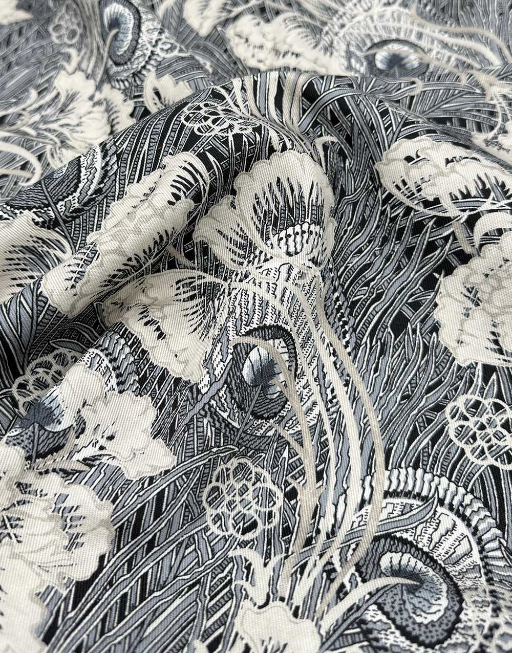 In a wonderful fusion of influences, this glorious pattern brings together two signature styles that have defined Liberty’s artistic identity since the 1880s. A nod to the Aesthetic movement and Japanese design prevalent at the time, our iconic Hera has been juxtaposed with Hana, a beautiful pattern from the early 1900s. Brimming with refined decadence, Hera’s exquisitely intricate peacock feathers are complemented by a sophisticated layer of sweeping poppies and scattered blossom.