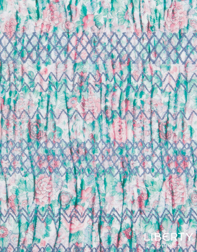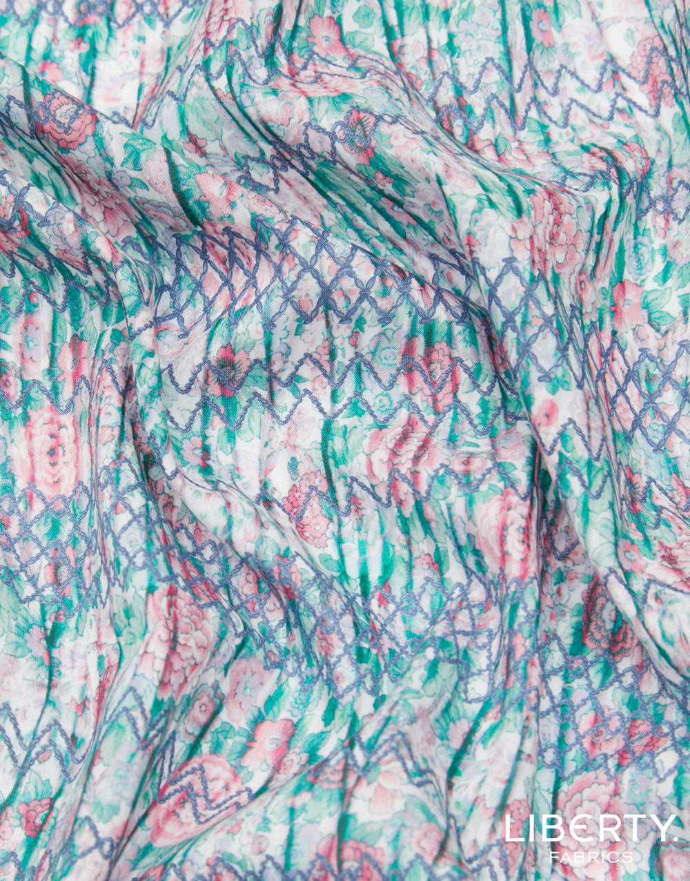 This reimagining of Liberty’s classic Elysian pays homage to the delicate smocked dresses of the 1887 childrenswear department. Diamond-shaped stitch details create the illusion of pleated, gathered fabric, adding a nostalgic, textural charm to the floral design.