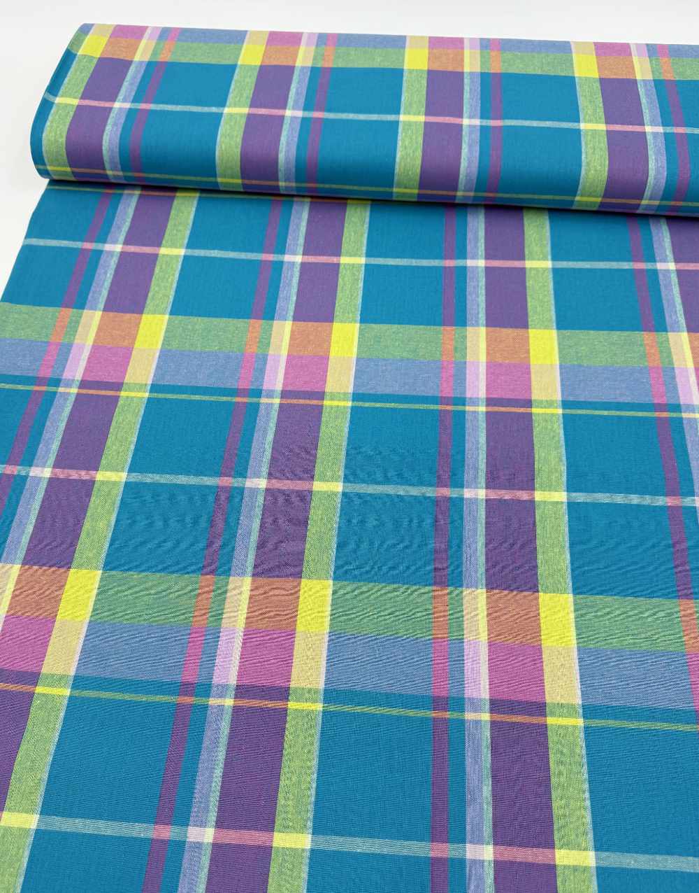 Dive into colour with Electric Lagoon! A vibrant woven Madras cotton bursting with turquoise, lime, orchid and bubblegum pink. Bold yet breezy, this fabric brings instant joy to any project, from summery shirts and swishy skirts to standout accessories.