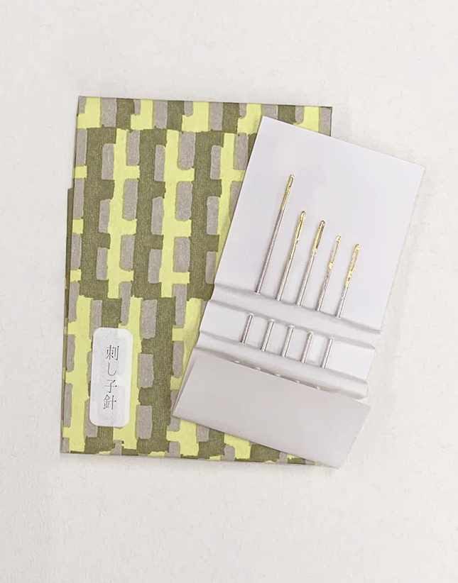 Top quality Sashiko needles made in Hiroshima and wrapped in Chiyogami paper made by Haibara, a long-established Japanese paper company. Each pack contains 5 needles of 3 different sizes