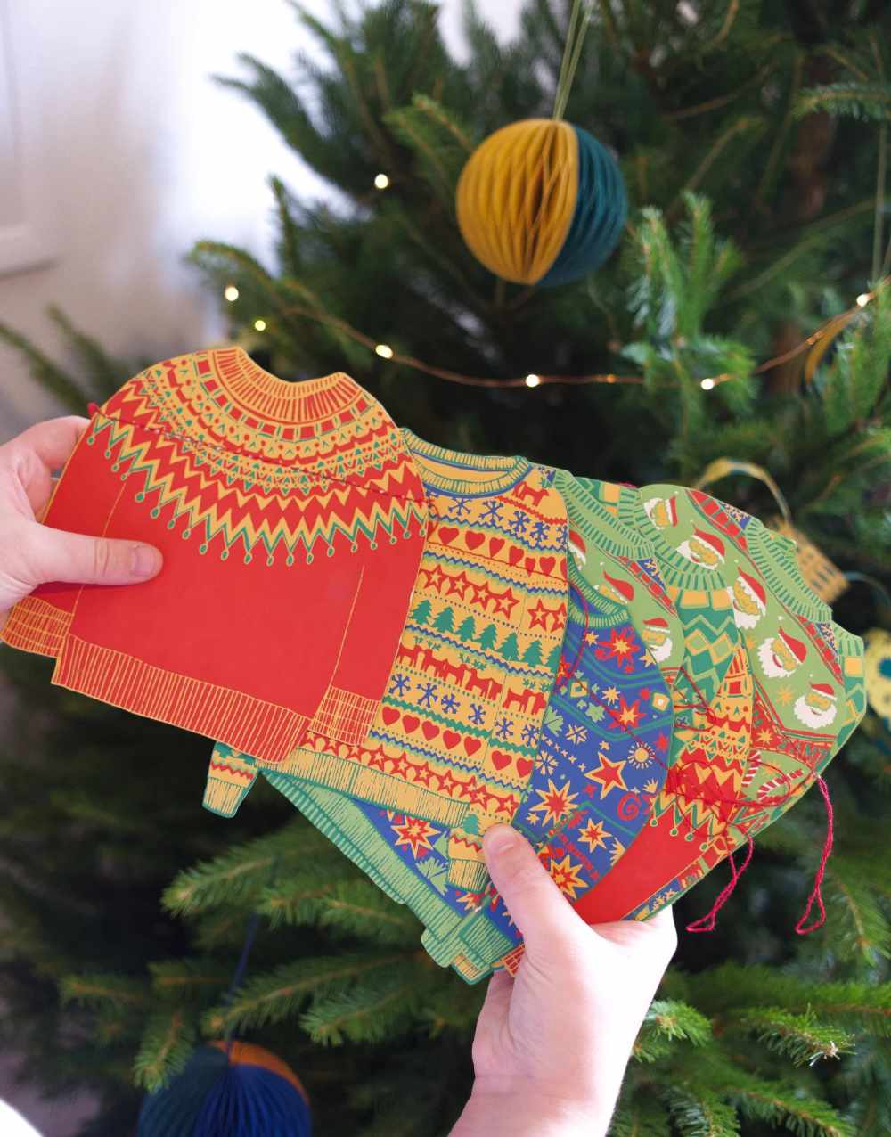 Brave the winter in style! This festive Christmas Jumpers Garland features ten hand-printed, screen-printed paper winter jumpers sewn on strong cotton thread. With three metres of double-sided handmade cotton paper and hanging loops on either end, this garland is ready to hang and bring Christmas cheer to your home!