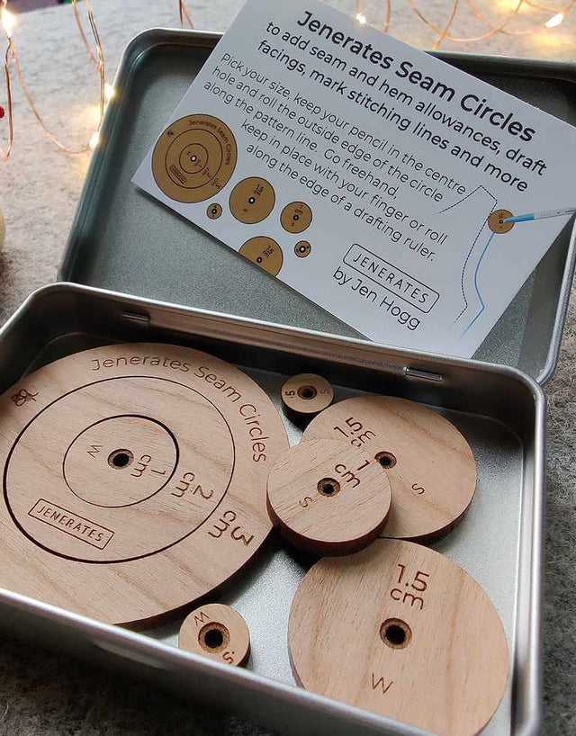 Use these unique interlocking circles to add or subtract seam and hem allowances to your sewing patterns. Available in cm or inches. Each kit contains circles to add from 0.5cm to 3cm or 1/4" to 1" and there are two options of centre hole for each: small for a pencil, and large for a fabric pen.