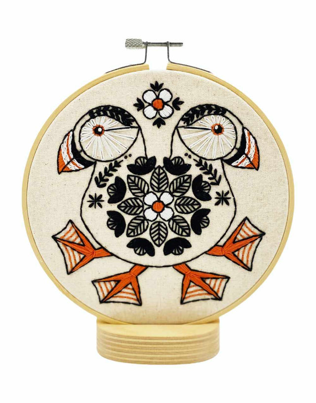 A bold and fun Puffin designed in Hook Line & Tinker's signature Scandi inspired folk style. With a tonal palette of 3 colours, the sampler uses a combination of satin, link, back stitch, chain, and French knots.