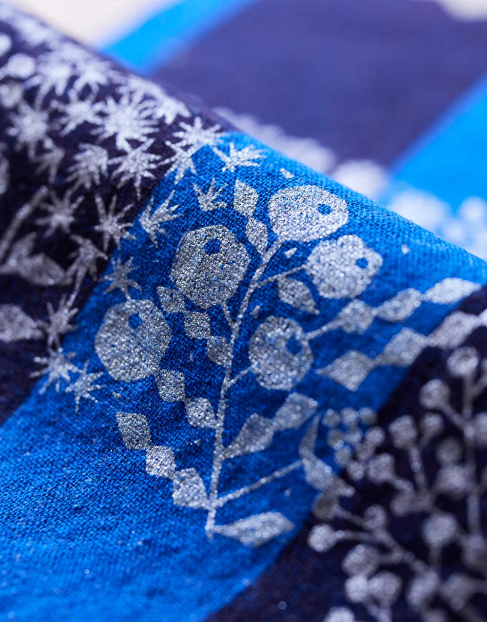 Blue Lattice and Metallic Silver Japanese Cotton Linen Fabric, Echino