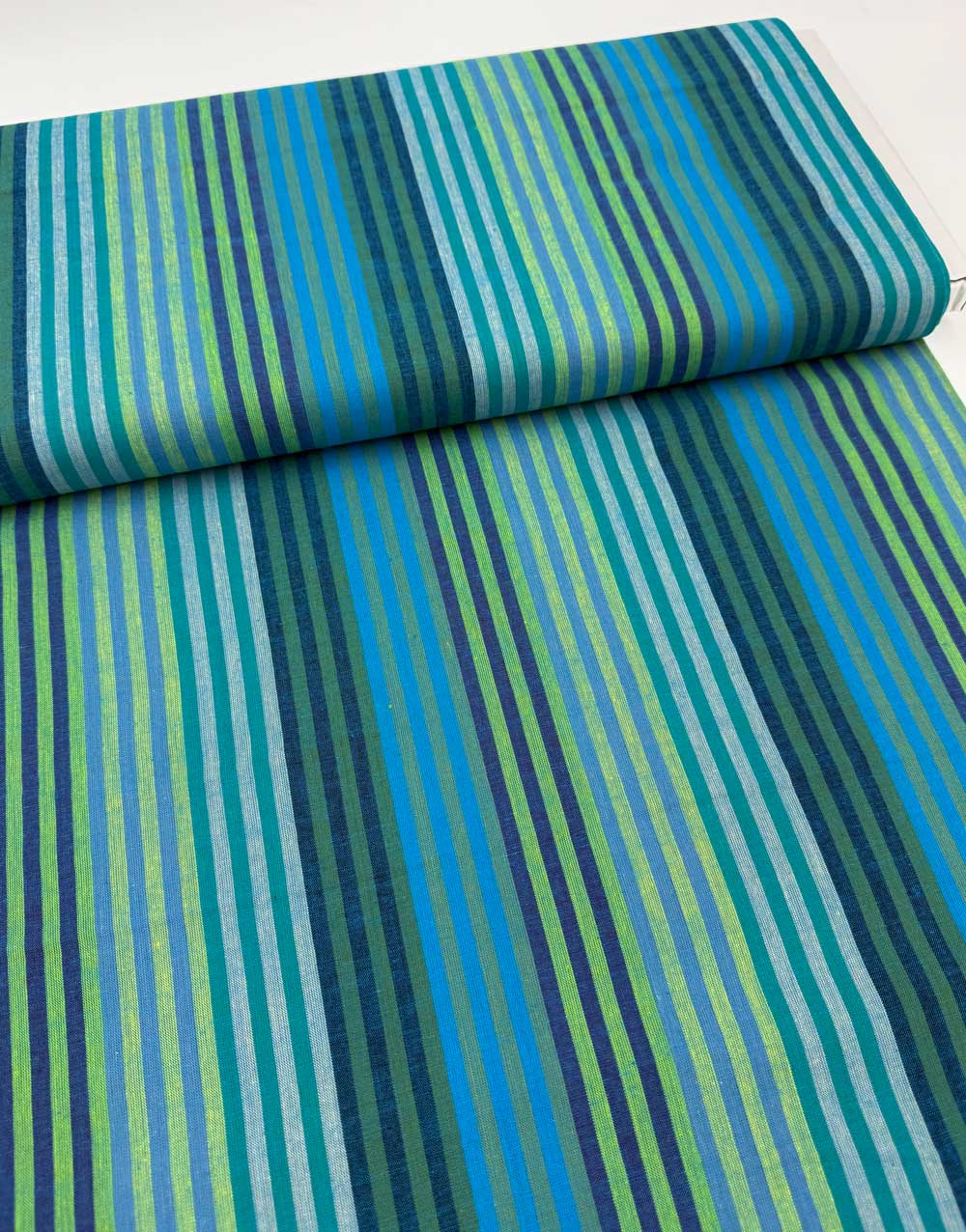 A vibrant stripe of greens and blues, Aqua Caterpillar is a fresh take on Kaffe Fassett’s iconic stripe. Narrow lines in turquoise, lime, jade, cobalt and seafoam creating a playful wave of colour.