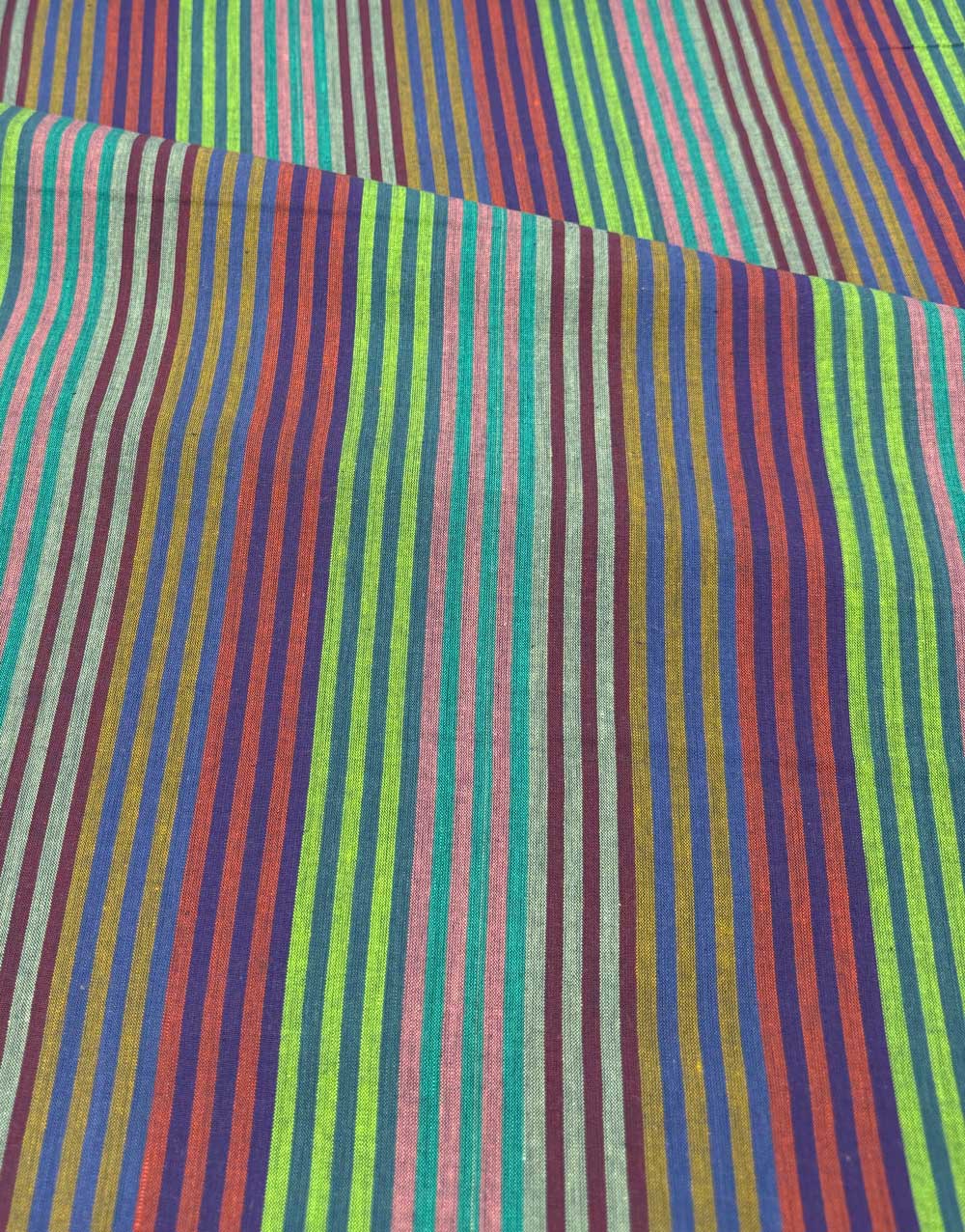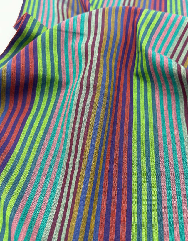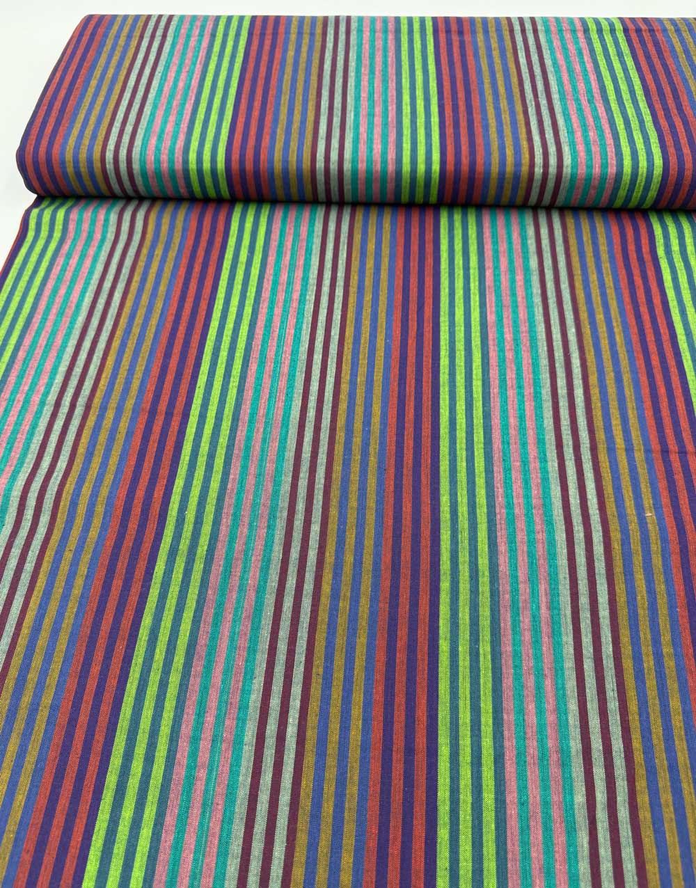 A bold celebration of colour, this Kaffe Fassett shot stripe brings together zesty greens, pinks, cobalt, plum, and sunshine yellow in a lively rhythm of narrow bands. The interplay of hues creates a dynamic stripe that feels both playful and sophisticated, with tones shifting and shimmering as the fabric moves.