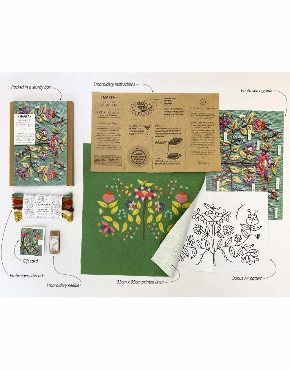 A stunning complete embroidery kit to stitch the beautiful Marta design by Kasia Jacquot. The 100% linen panel is beautifully printed and is ready for you to add your stitches. The kit contains everything you need and even includes a bonus print of the design so you can use it on another project. When complete why not stitch your panel into a piece of clothing, use it in a quilt, hang it on your wall, make it into a pillow, display it on a table, turn it into a bag . . . the possibilities are only limited by your imagination!