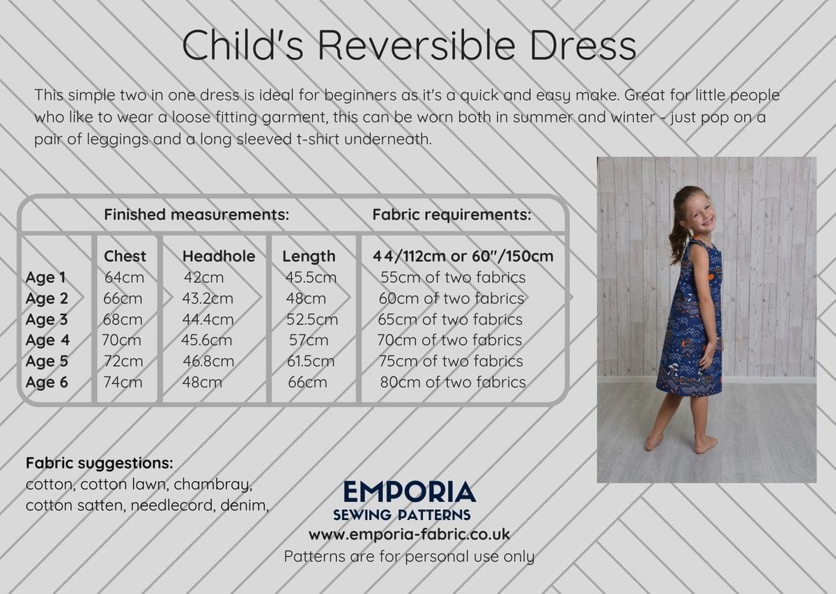 A complete dressmaking kit to make a marvellous reversible dress for girls aged 1 to 6 years. With no closures or darts this really is a super simple pattern that is ideal for beginners. Easily wearable in all seasons, pair it with sunnies and sandals in warmer months or pop it on over a long sleeved top and wear with leggings and boots in the winter - little girls will love the fact that you get two dresses for the price of one!