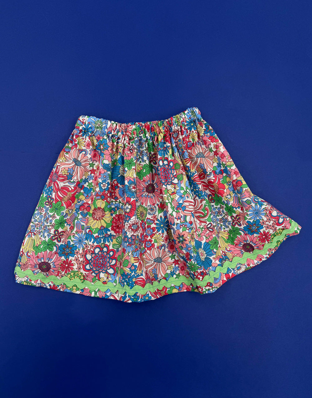 Simply stitch the edges together, create a channel for the elastic, add a touch of ric rac for decoration, and just like that - your skirt is ready to wear! A delightful make with beautiful results.