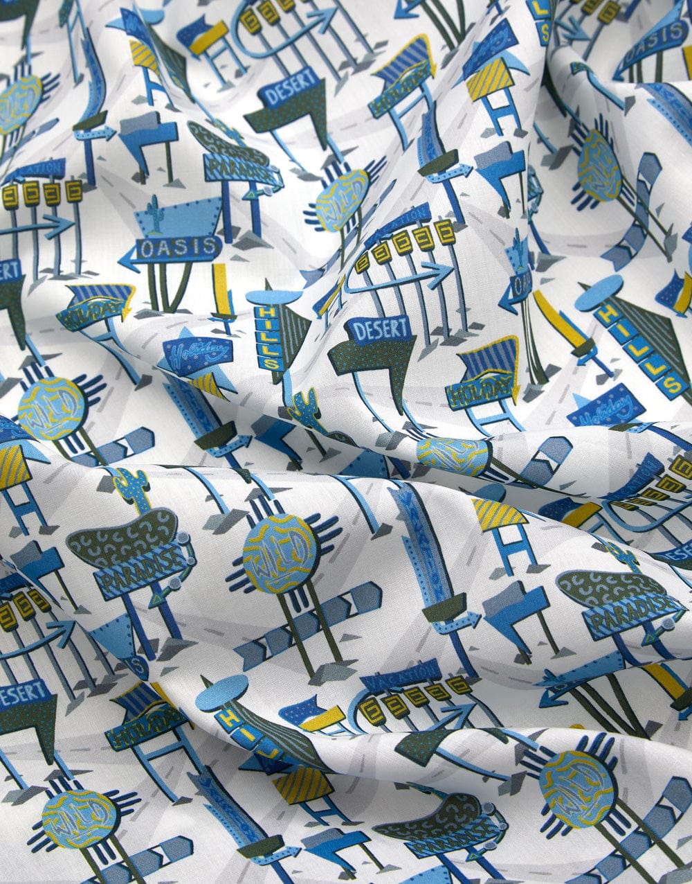 Holiday Highway is a poppy conversational design painted in gouache – looking at the famous Route 66 across the American desert, dotted by motel signs spotted along the way.
