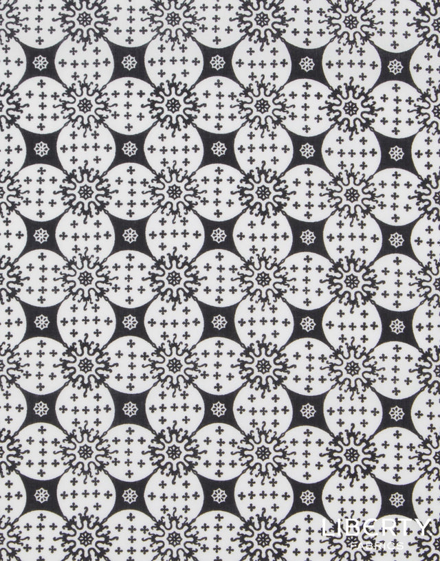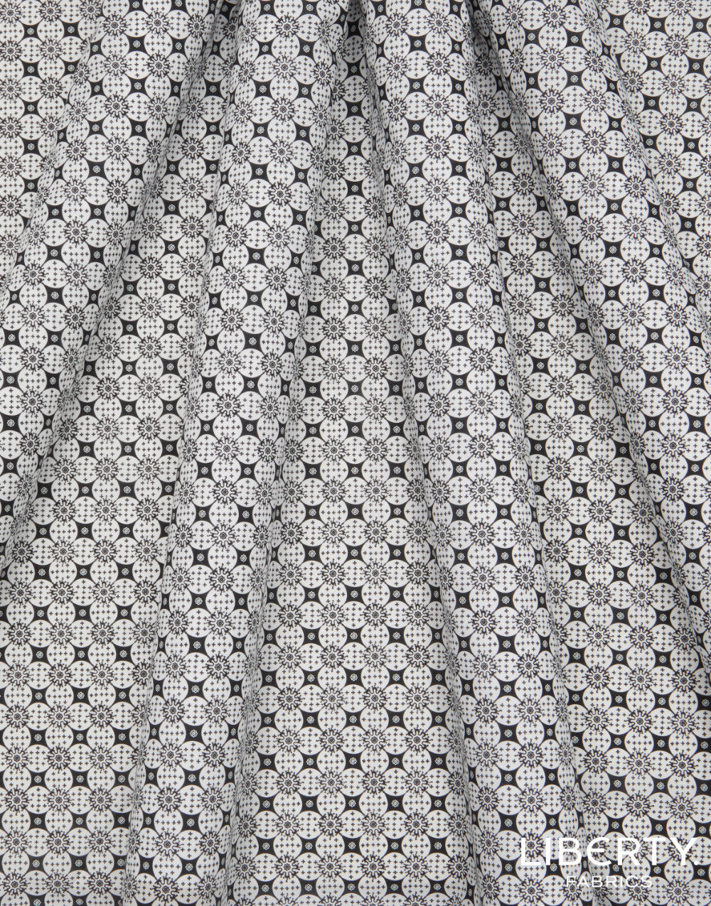 Echoing the fractal geometries inherent in floral and plant forms, Misha is a striking multidirectional print inspired by a Liberty furnishing fabric dating from the 1910s. Monochromatic shapes multiply and divide in a kaleidoscopic layout, revealing unexpected spatial relationships through radially symmetric flowers. This print is part of the Floral Focus narrative of the AW24 collection – inspired by countless artists who have attempted to tame their unruly blooms through the genre of still life, this series is a true celebration of organic forms and flourishes.