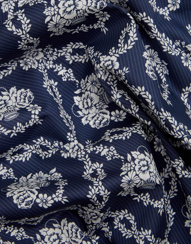 Designed from a series of archival silk fragments discovered in a 1920s Liberty pattern book, Garland Hampers captures the essence of damask wallpapers and upholstery fabrics traditionally printed in the 18th and 19th centuries. Its intricate floral hamper baskets, encircled by diagonal leafy wreaths are set against a subtle stripe backdrop, which evoke a timeless blend of classical elegance and contemporary finesse. This print is part of the Penelope’s Garden chapter of the Liberty Fabrics & Bridgerton collection - paying homage to the beautiful garden settings of the Regency era, where dramatic botanical displays create blooming backdrops perfect for captivating scenes.