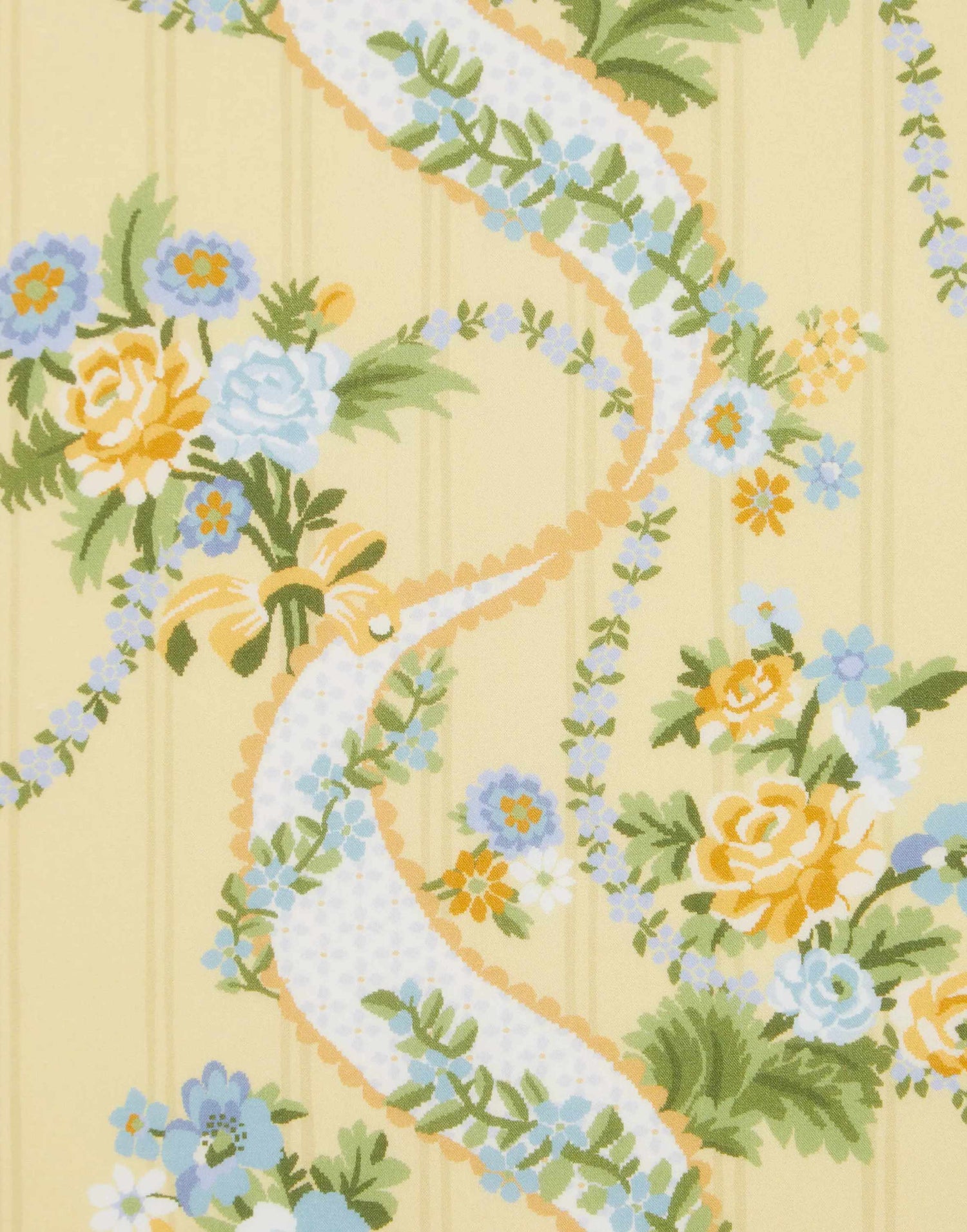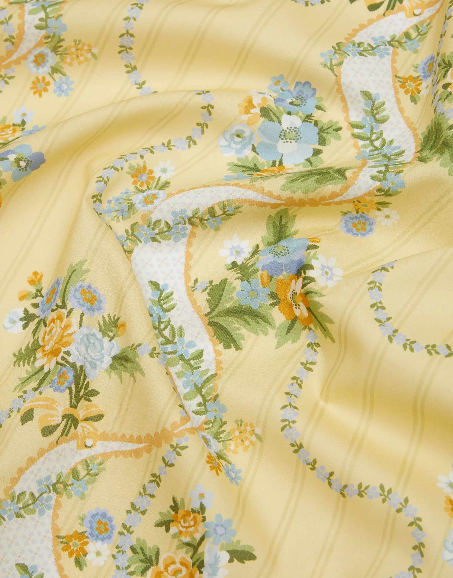 Inspired by a collection of 18th century hand-painted point papers from the Liberty archive, Ribbon Cascade exudes poetic allure and graceful fluidity. Nostalgic rose, poppy, and daisy bouquets peek through finely embroidered ribbons and cascading floral chains, enhanced by a palette of soft pastel hues. The design takes on an eclectic twist with the addition of a fine background stripe, exuding a sense of whimsy and sophistication. This print is part of the Regency Bouquet chapter of the Liberty Fabrics & Bridgerton collection - inspired by the lavish costumes, formal soirées, and lively garden parties depicted in the series, these vividly exuberant blooms are characterised by a sense of realism.