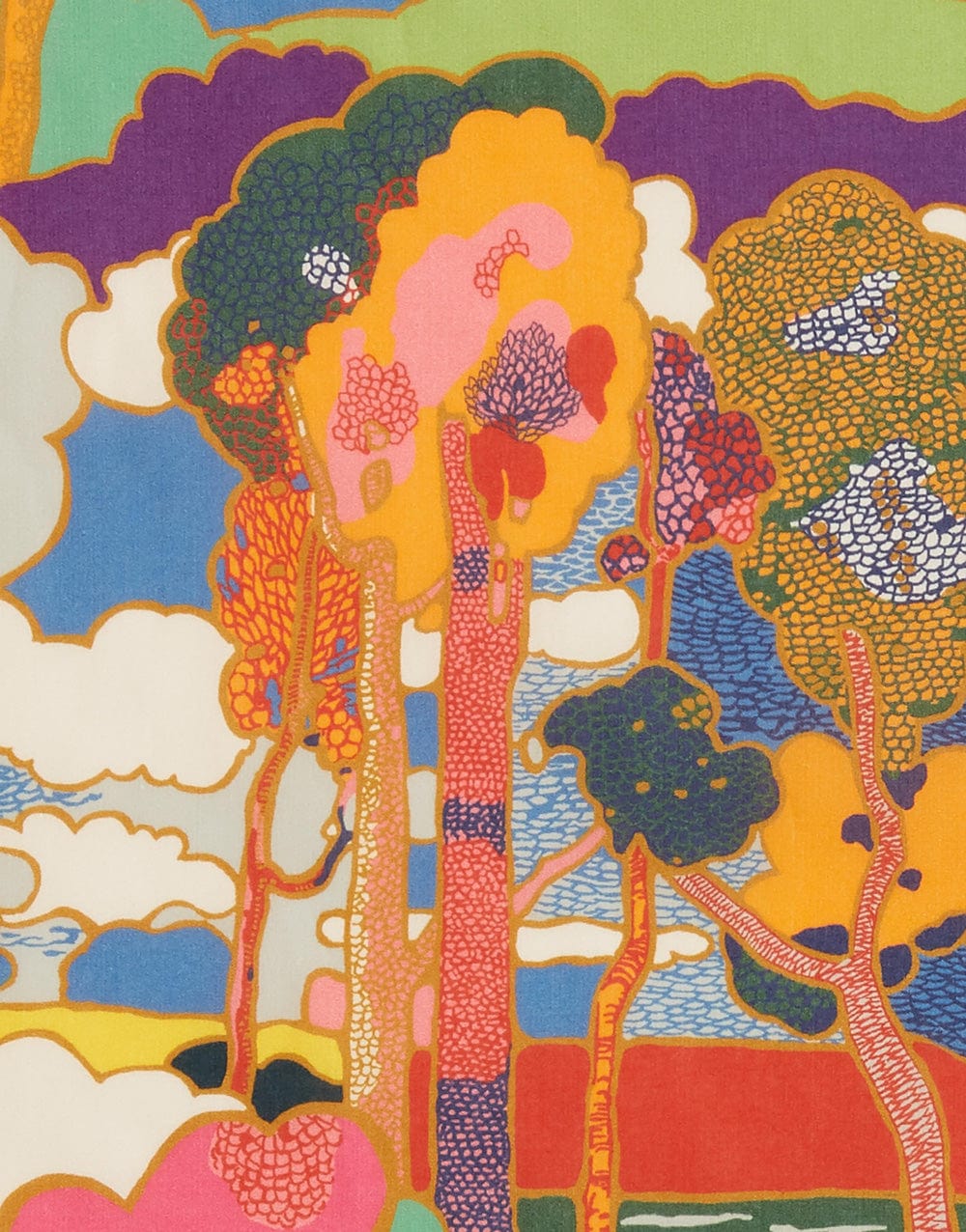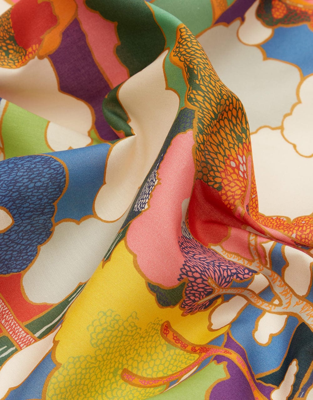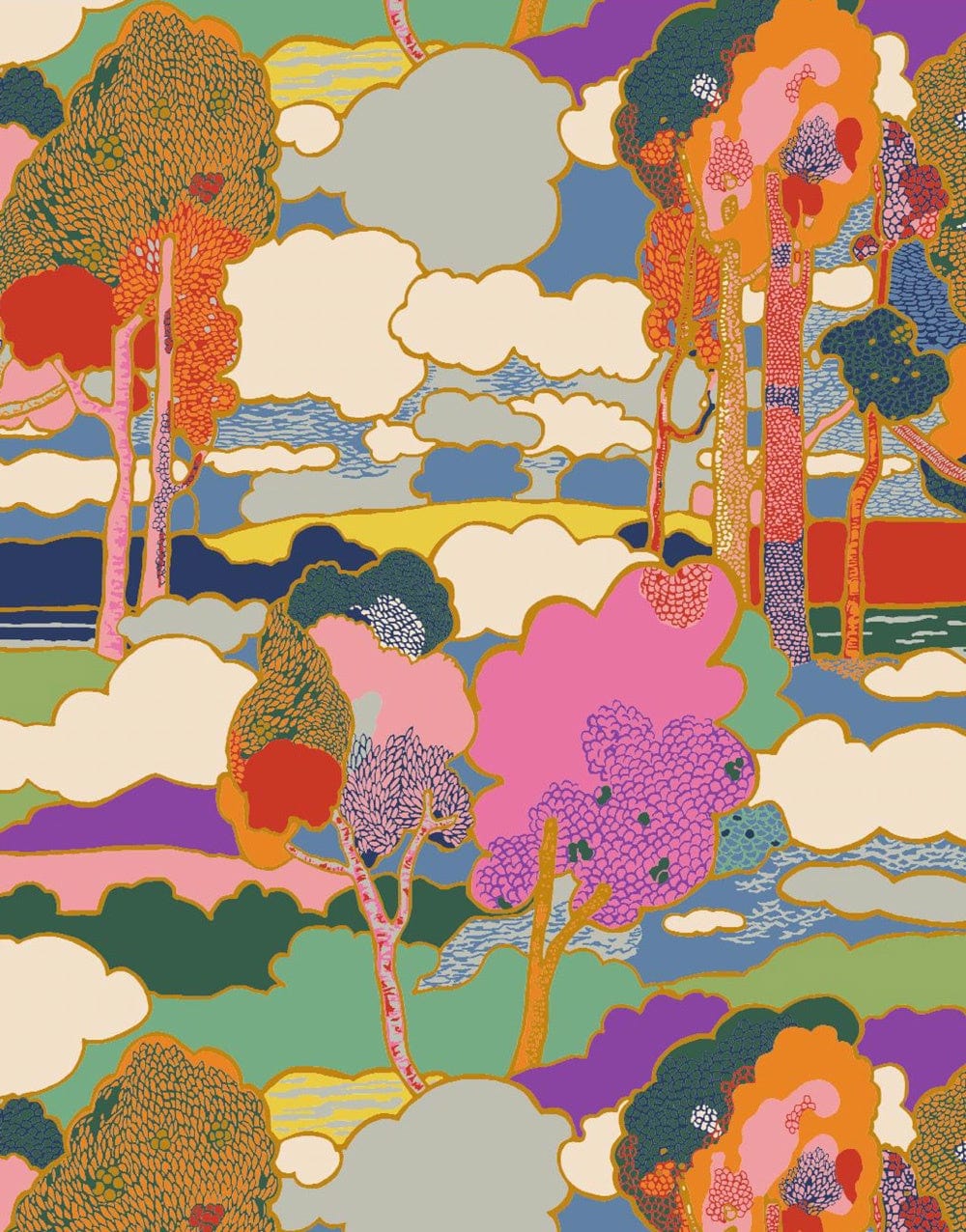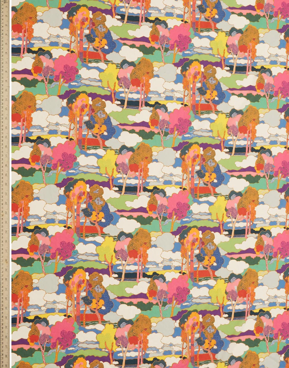 Prospect Road is an archival classic, based on a Liberty design from 1968. A revival of traditional Art Nouveau landscape prints, it features subtly arranged clusters of trees in a dreamy, jewel-toned setting.