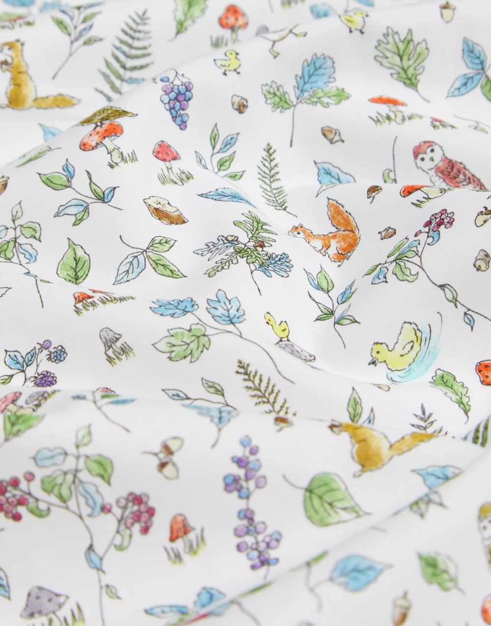 This conversational design captures a variety of forest creatures frolicking among autumn leaves, mushrooms, acorns and berries.