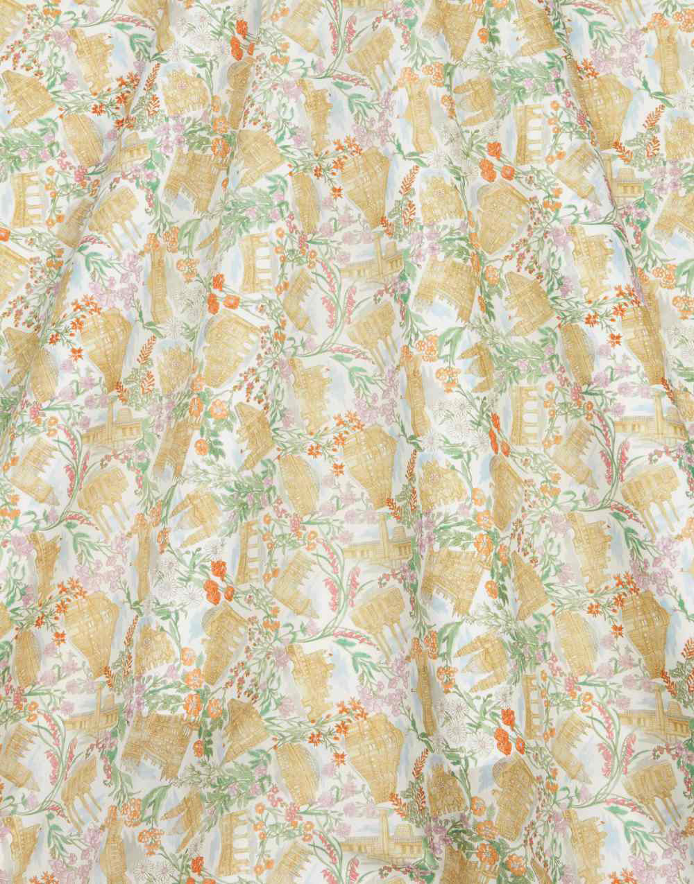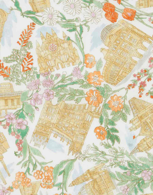 Originally inspired by a scarf pattern discovered in the Liberty archive, this design portrays the beautiful and varied architecture of London, framed by a selection of glorious British wildflowers. The illustrations were hand drawn in the Liberty studio and a texture was added to evoke the nostalgic charm of a vintage scarf.