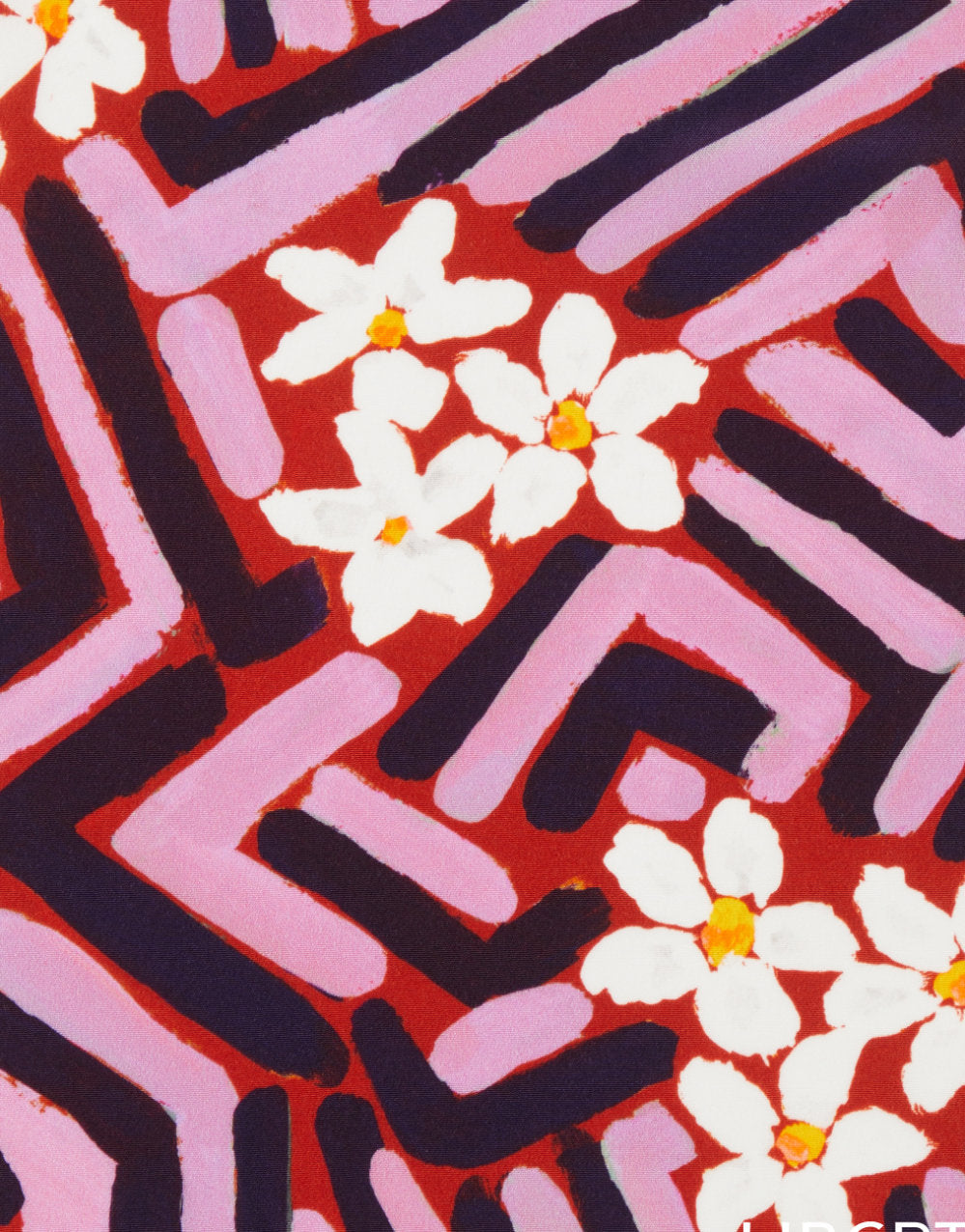Inspired by the impressionistic still life paintings of Matisse, this dynamic combination of strong diagonal lines in contrasting hues is punctuated by textured florals, helping to create movement across the fabric.