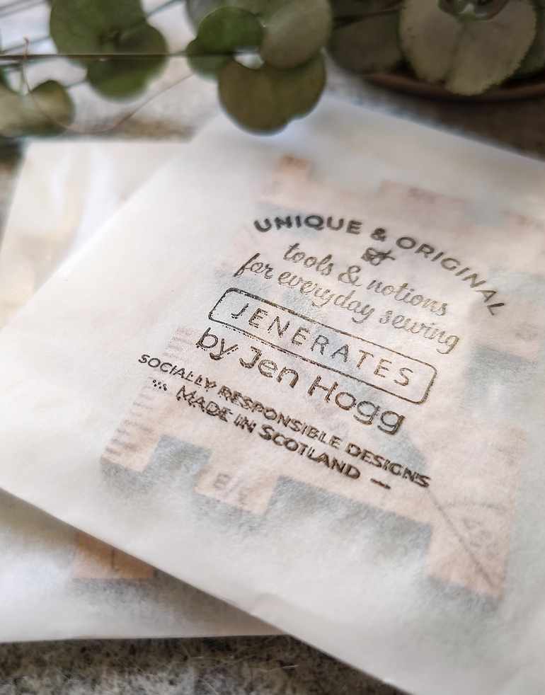 A nifty seam guide useful for checking your seams and hems, in centimetres. Plus there's a cut out to mark a 45° angle, great for mitred corners. Made in 4mm cherry wood veneer - easy to pick up - and packaged in a hand-stamped glassine paper bag.