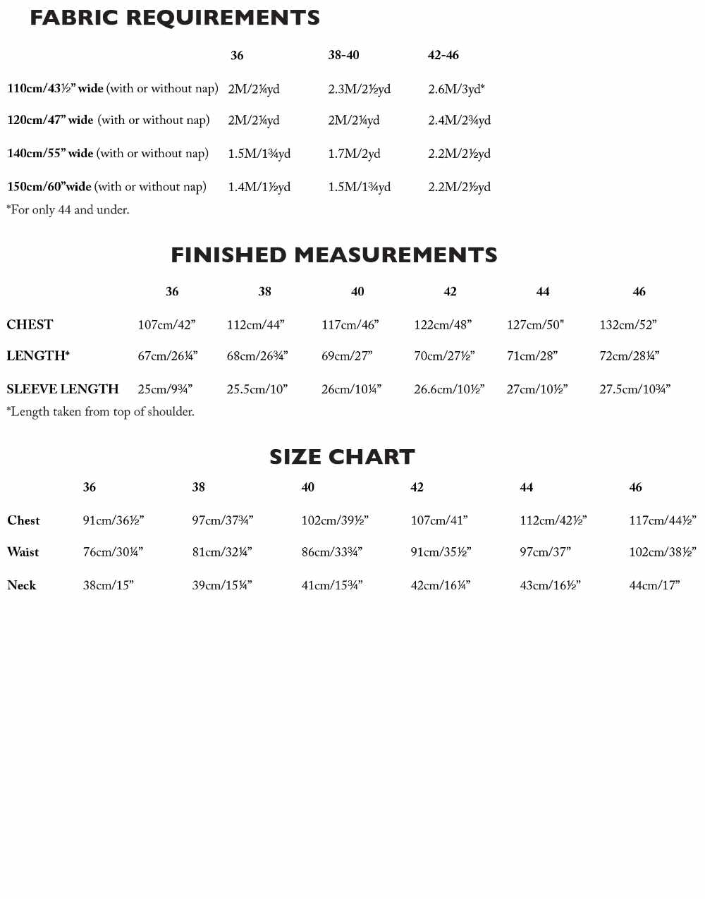 Suggested Fabrics: Linen, linen blends, tencel, tencel/linen, 4-80z denim, cotton chambray, indian handweaves, fine wool or needlecord.