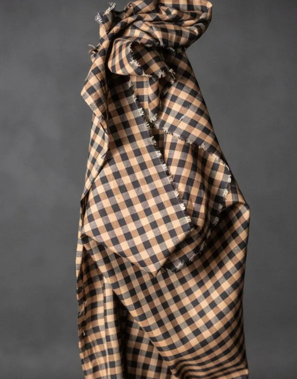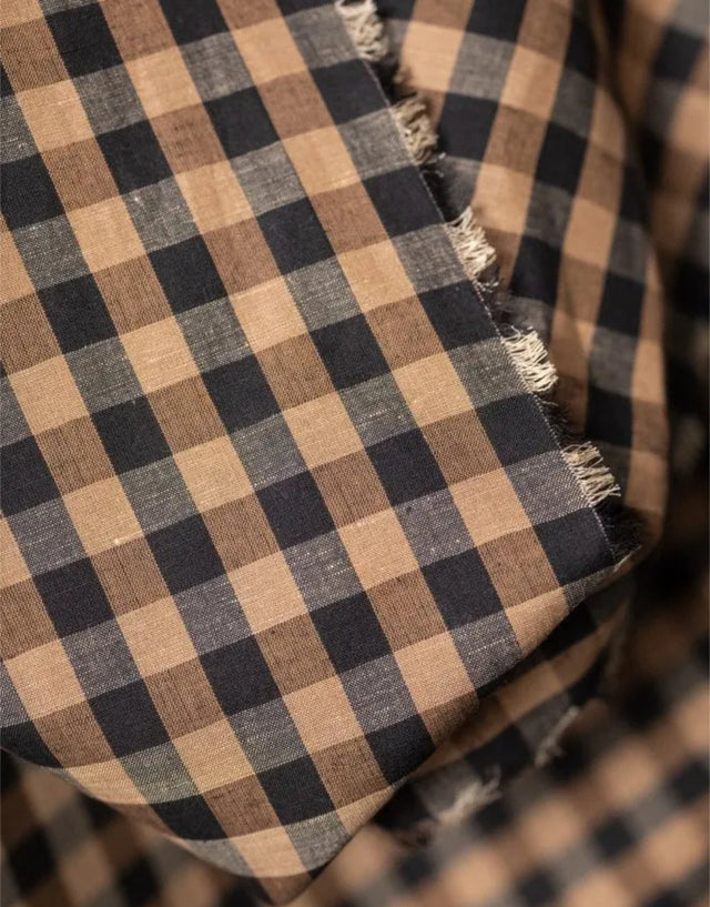A soft cotton and linen blend in a sophisticated check of black and coffee tones. A versatile cloth that is a great alternative to linen. A versatile cloth that is a great alternative to linen. Summer weight cloth suitable for dresses, tops, shirts and skirts.